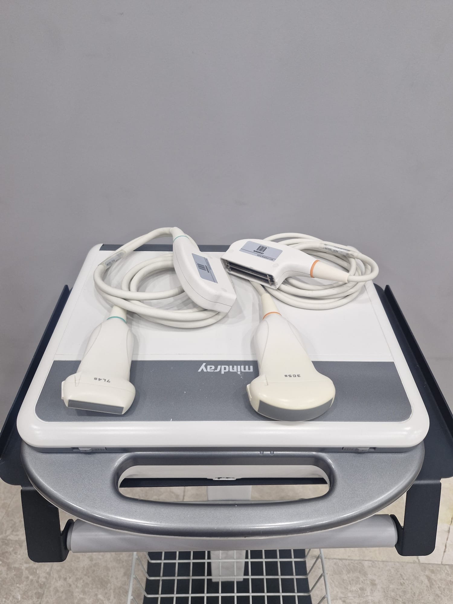 Upon examination of the images, two different ultrasound probes (transducers) and transport equipment are included with the system. The model names of the probes are clearly visible on the labels at the connector ends.