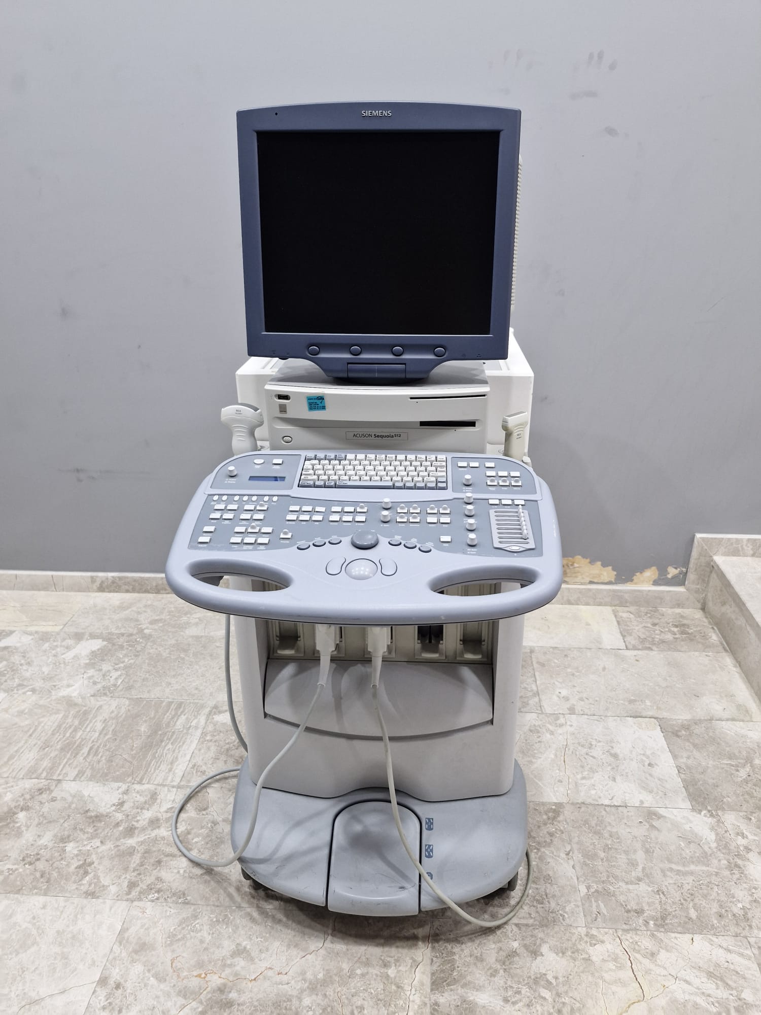 The examined product is a Siemens / Acuson Sequoia 512 Ultrasonography System with a medical history, including its probes (6C2 and 8L5), showing cosmetic wear (yellowing) due to its age but maintaining its integrity. No physically missing parts (keys, covers, etc.) are visible.