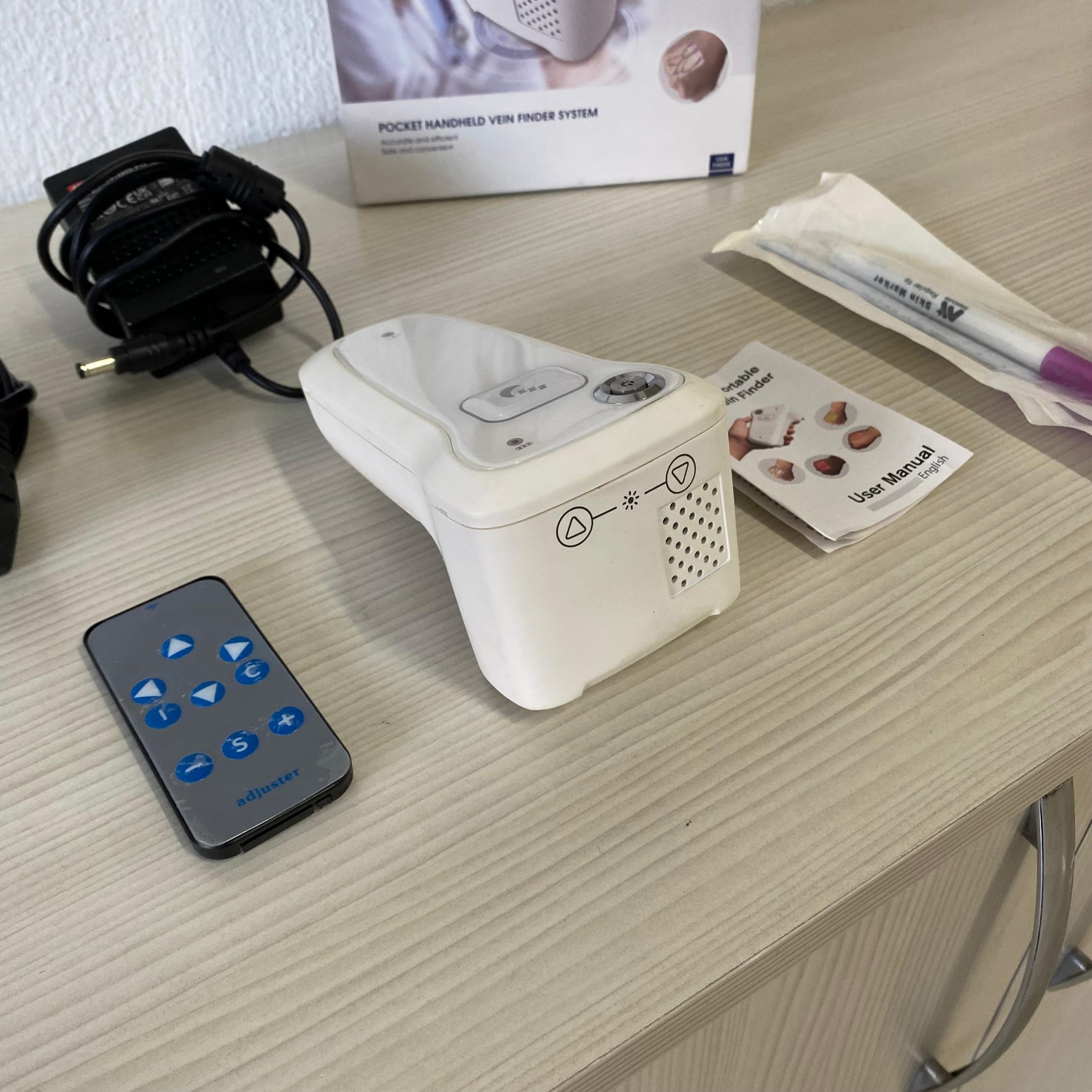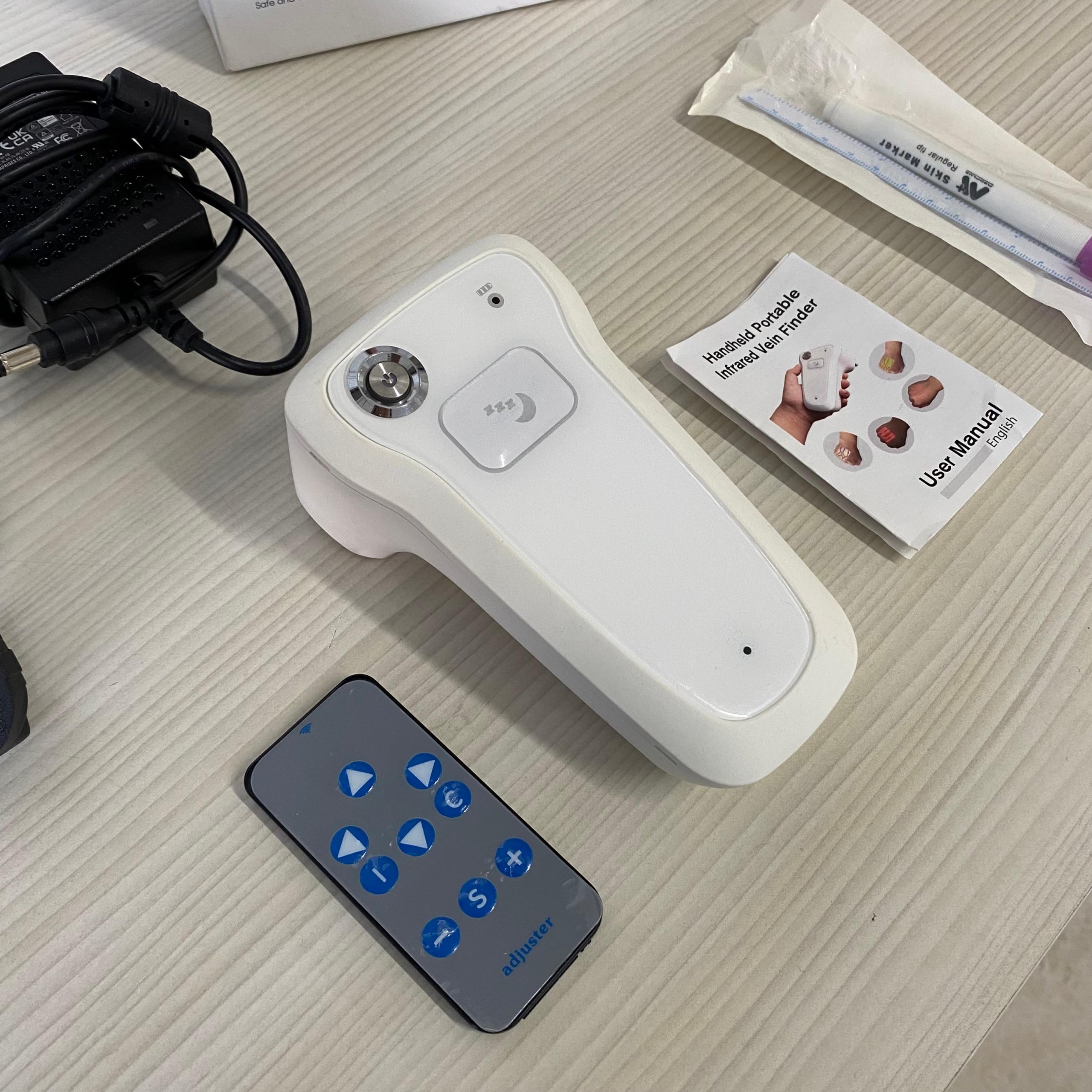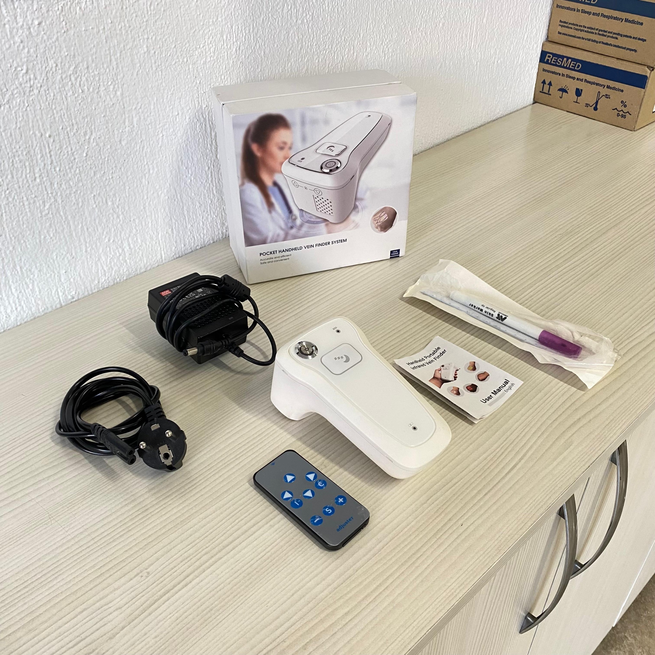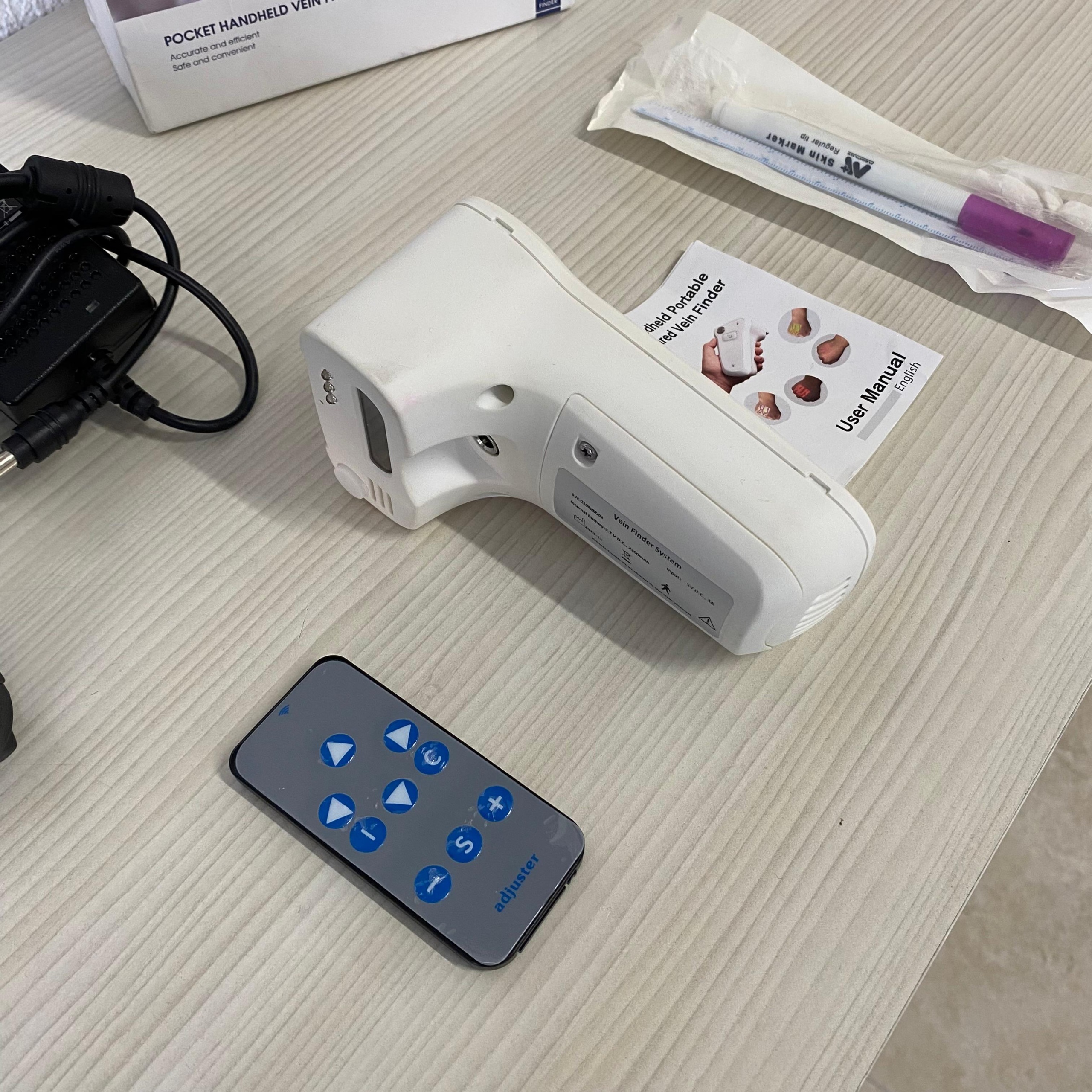 The examined images show a portable medical imaging device, known as a “Vein Finder,” used to locate subcutaneous veins using infrared technology. The device is portable and suitable for handheld use. The set consists of the main unit, a charging adapter, a remote control, a skin marker pen, and its original box.