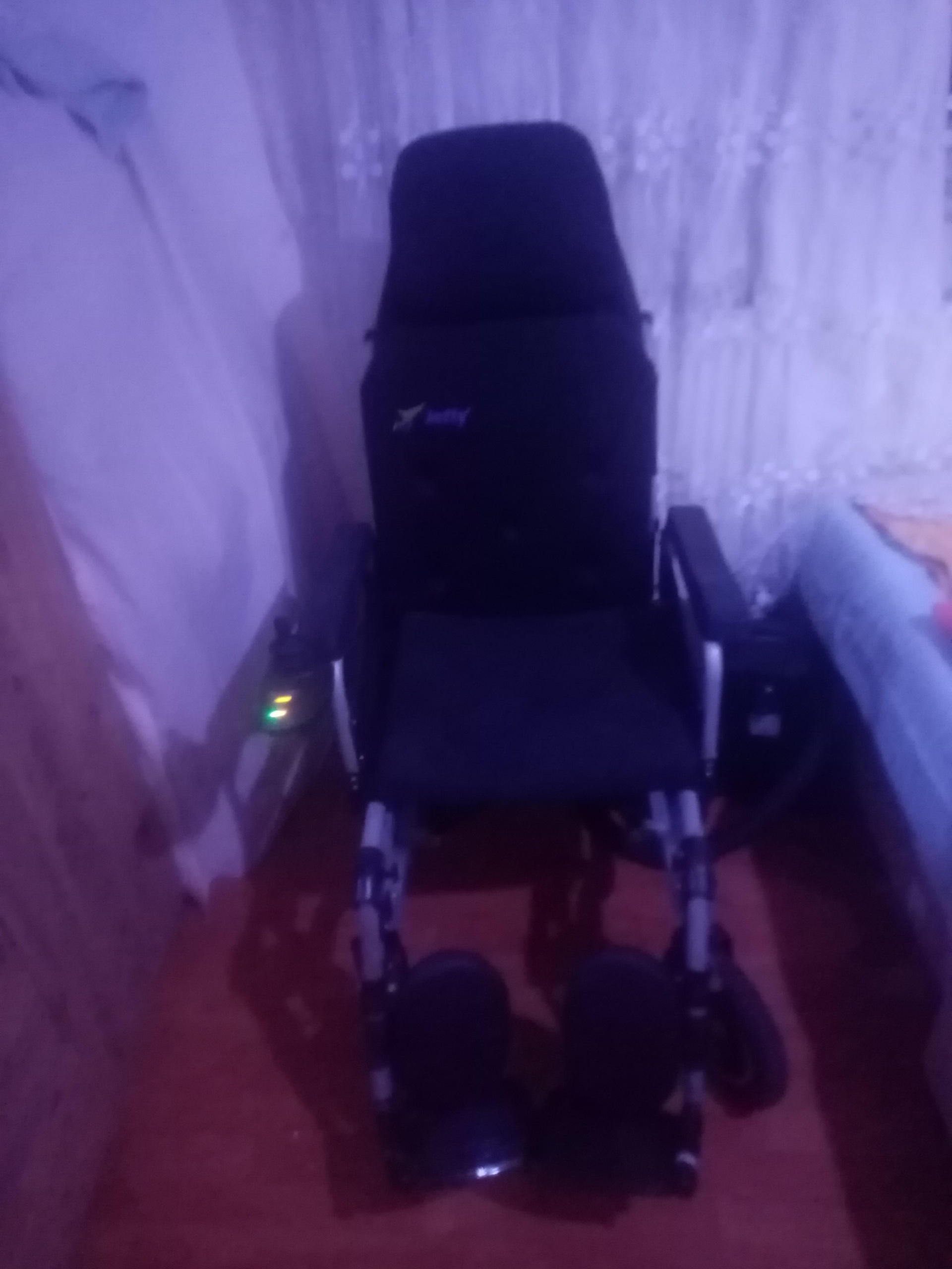 The mechanical parts of the product, such as the chassis, wheels, and footrests, have an integrated structure. The rear wheels are larger and connected to the motor; the front wheels are smaller and designed to enhance maneuverability. A joystick control unit is located on the right armrest of the device. The illuminated green lights on this unit indicate that power is supplied to the device’s electronic system and that its battery has some charge. The battery box and motors are located at the lower rear part of the seat.