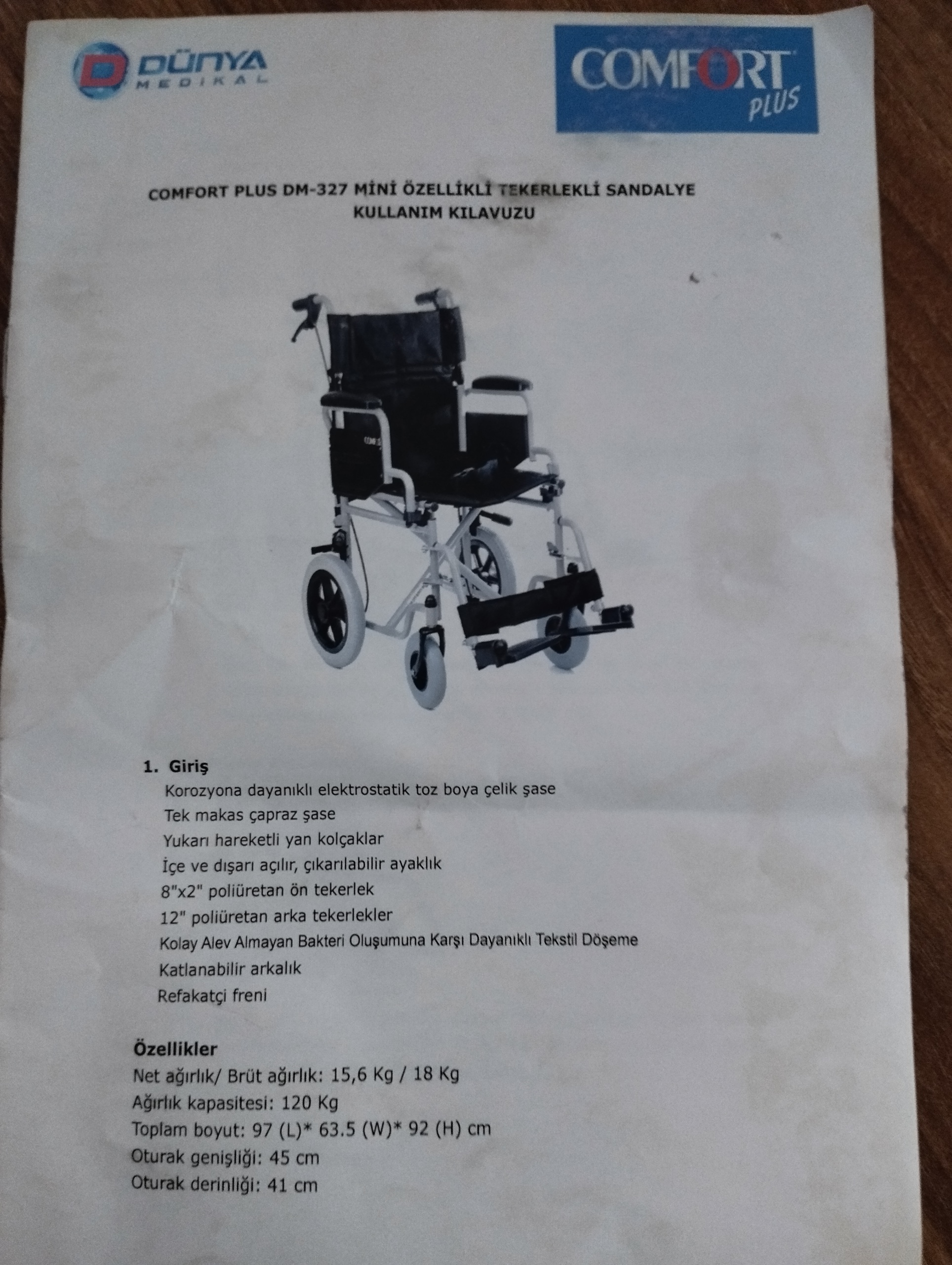 - In the second visual, the cover page of the “User Manual” belonging to the product is present. The model code of the product is clearly stated in the title of this document as “COMFORT PLUS DM-327 MİNİ ÖZELLİKLİ TEKERLEKLİ SANDALYE” (COMFORT PLUS DM-327 MINI FEATURED WHEELCHAIR).