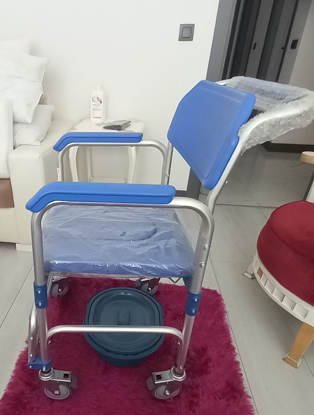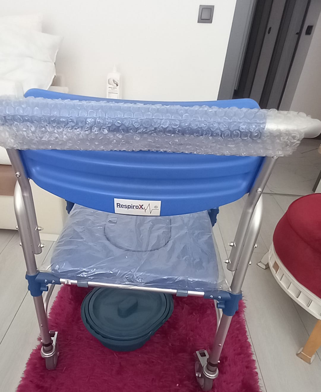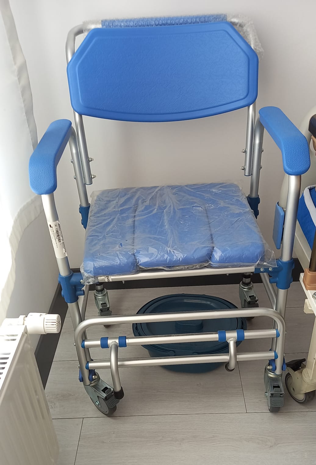 - Commode (Bucket): A dark blue, lidded plastic waste bucket is placed beneath the chair.