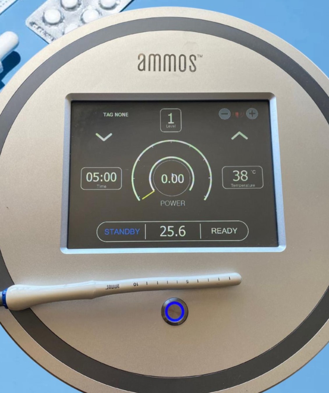 Görsellerde, bir stand üzerine monte edilmiş Ammos marka medikal bir cihaz ve cihaza bağlı bir uygulama probu bulunmaktadır. Cihaz, muhtemelen bir tür termal tedavi veya ablasyon prosedüründe kullanılmak üzere tasarlanmıştır. Ürünün genel kondisyonu oldukça iyi görünmekte olup, kullanılmış olmasına rağmen temiz ve bakımlı bir durumdadır. Ekranda veya kasada herhangi bir ciddi fiziksel hasar tespit edilmemiştir. Cihazın ekranı çalışır durumdadır ve çeşitli operasyonel parametreleri net bir şekilde göstermektedir.