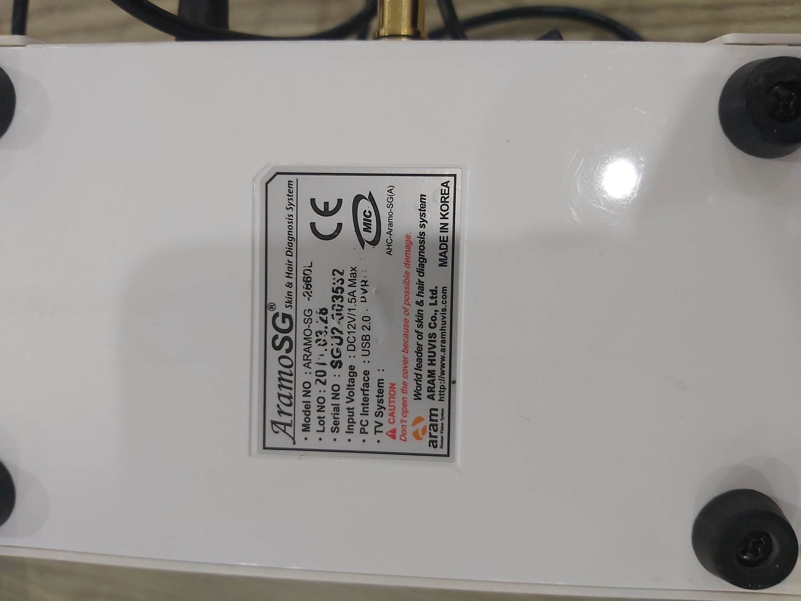 Görsellerde yer alan cihaz, etiket bilgilerine göre bir Aramo SG marka ARAMO-SG -2560L model cilt ve saç analiz sistemidir. Bu sistem, ucunda lens bulunan bir el probu ve ana üniteden oluşmaktadır. Ürünün temel işlevi, cildin nem, gözenek, leke ve kırışıklık gibi değerlerini analiz etmektir. Ayrıca saç derisi durumu, saç yoğunluğu ve kalınlığı gibi parametrelerin teşhisinde de kullanılır. Görsel analizler, ürünün estetik ve dermatoloji merkezleri veya kişisel bakım uzmanları tarafından profesyonel amaçlarla kullanıldığını göstermektedir.