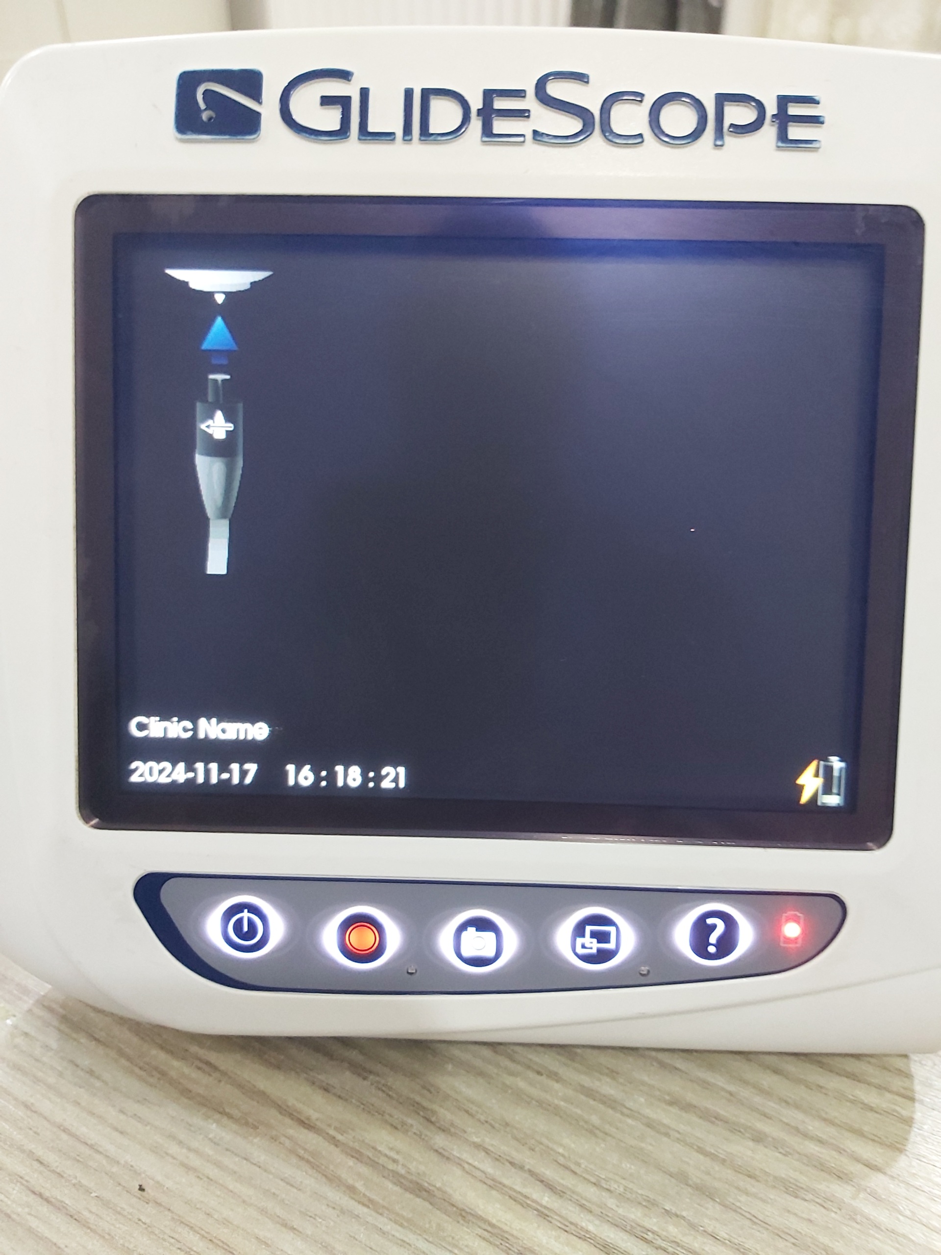 Cihaz açıldığında ekranda “GlideScope TITANIUM” logosu görünmektedir. Daha sonraki bir ekranda ise laringoskop bıçağının bağlı olmadığını gösteren bir simge, batarya durumu, klinik adı için bir alan ve “2024-11-17 16:16:21” tarih ve saat bilgisi yer almaktadır. Ön paneldeki düğmelerden güç, kayıt ve fotoğraf çekme gibi fonksiyonlara sahip olduğu anlaşılmaktadır. “Soru işareti (?)” simgesinin olduğu düğmenin kırmızı ışığının yanması, bir uyarı veya bilgilendirme durumu olabileceğini göstermektedir.