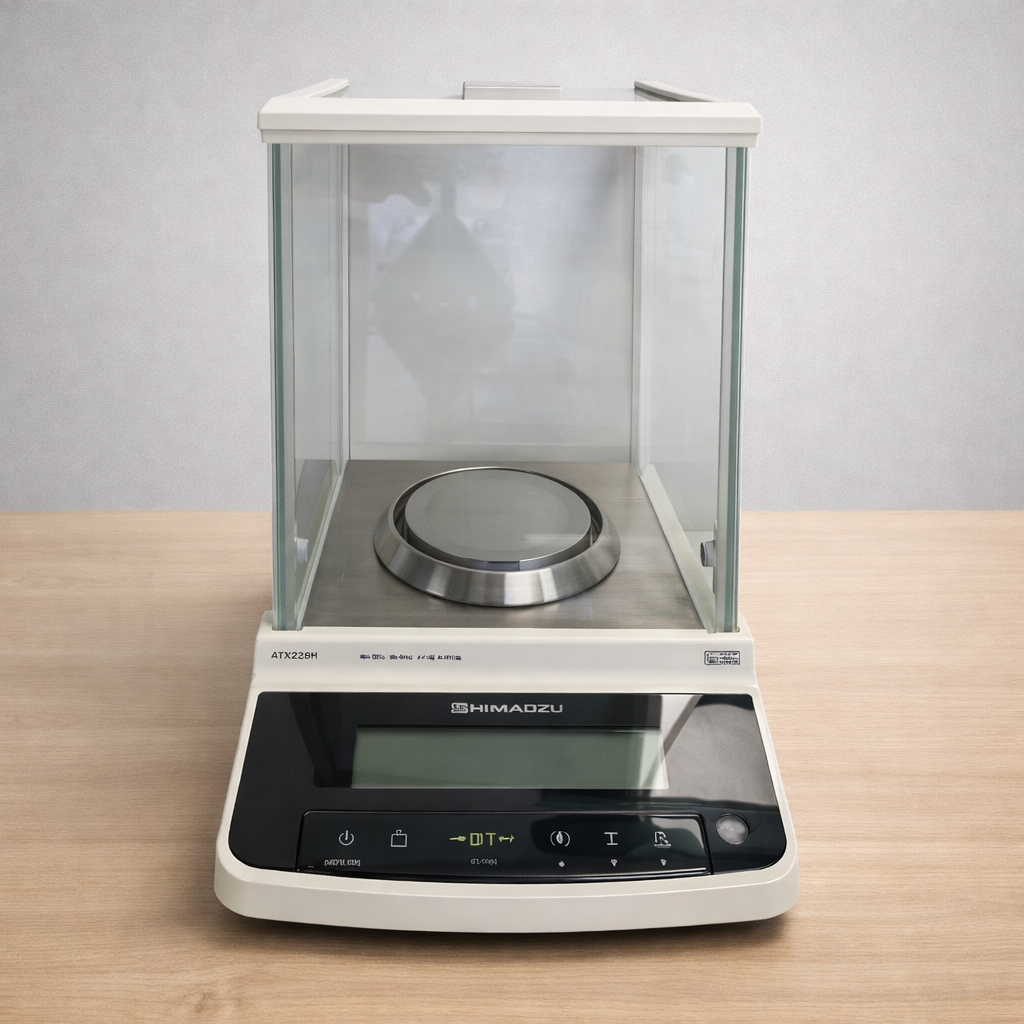 İncelenen görsel, laboratuvar ortamlarında hassas tartım işlemleri için tasarlanmış bir analitik terazi cihazına aittir. Cihaz; şeffaf rüzgar koruma kabini, dijital gösterge paneli ve metal tartım kefesinden oluşmaktadır. Ürün, bütünleşik bir laboratuvar cihazıdır.