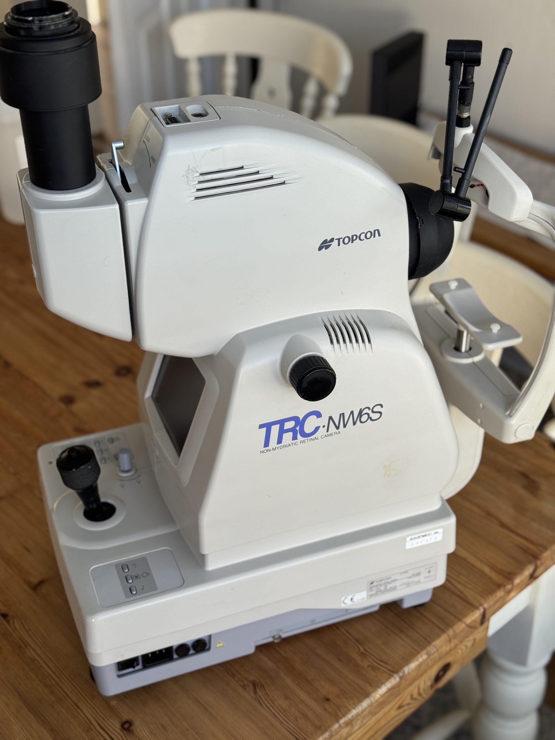 Görsellerde yer alan cihaz, bir Topcon TRC-NW6S Non-Mydriatic Retinal Kamera‘dır. Bu tıbbi cihaz, göz bebeğini büyütmeye gerek kalmadan gözün retina (ağ tabaka) katmanının fotoğraflarını çekmek için tasarlanmıştır. Oftalmoloji kliniklerinde ve özellikle diyabetik retinopati gibi rahatsızlıkların taranmasında kullanılır. Görseldeki ürün, bir ana ünite ve entegre hasta konumlandırma (çene ve alın dayanağı) mekanizmasından oluşmaktadır. Toplamda bir adet ana cihaz görüntülenmektedir.