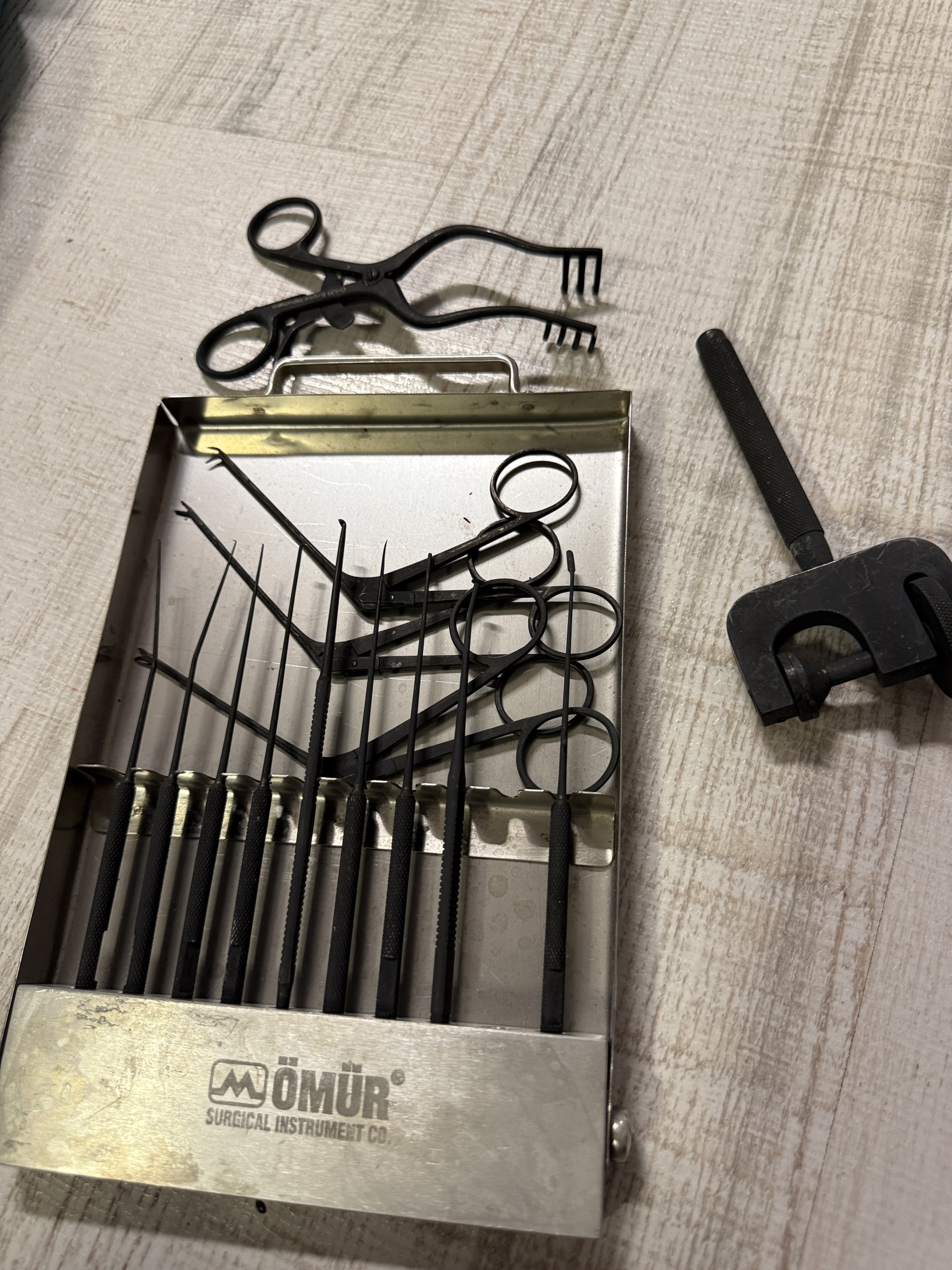 - Üretici Bilgisi: Tepsi üzerinde markanın altında “SURGICAL INSTRUMENT CO.” ibaresi yer almaktadır. Ayrıca ekartör üzerinde “OMUR Surgical Instruments” yazısı mevcuttur.