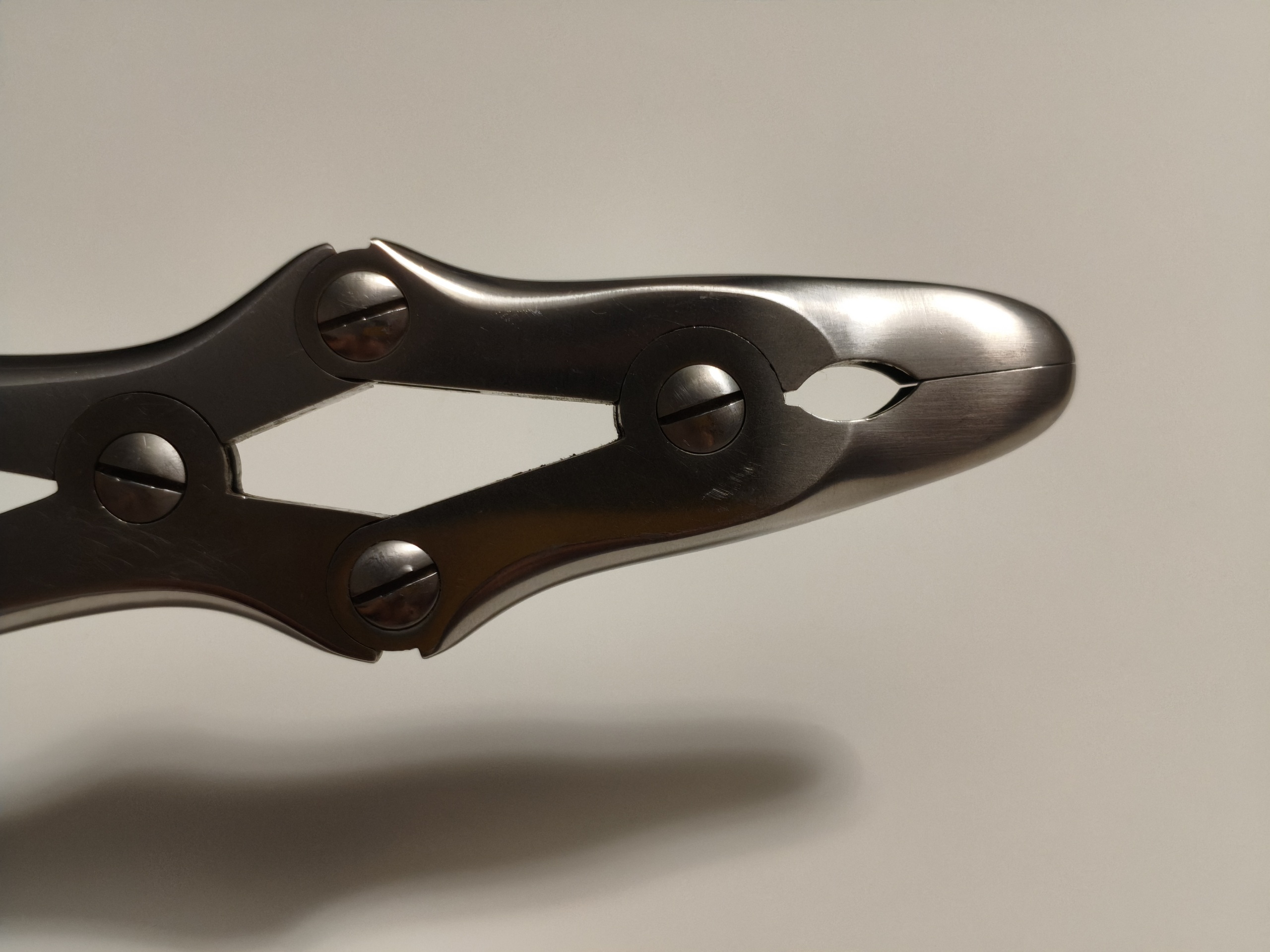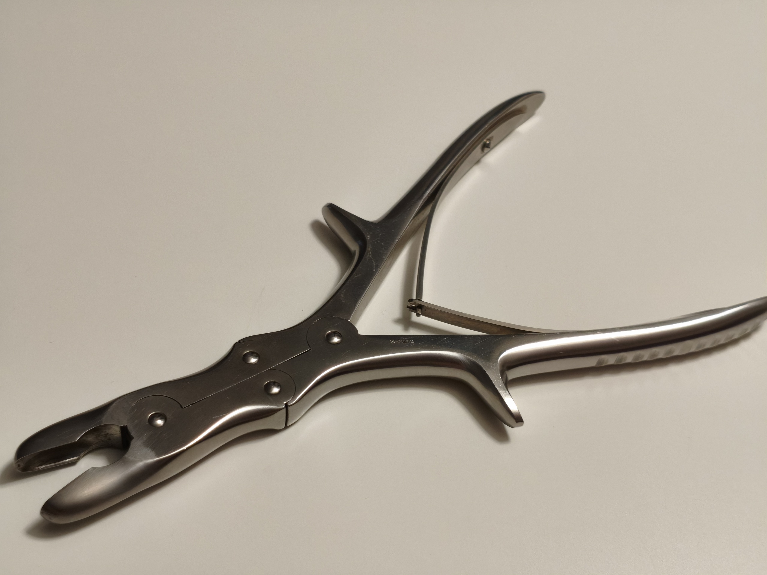 Görsellerde, cerrahi operasyonlarda kullanılmak üzere tasarlanmış, pense benzeri metal bir alet bulunmaktadır. Ürünün yapısı, kemik veya diğer sert dokuları kesmek ya da şekillendirmek için kullanılan bir kemik kesici (rongeur) olduğunu göstermektedir. Alet, paslanmaz çelikten imal edilmiş bir görünüme sahiptir. Analiz kapsamında toplam 1 adet ürün incelenmiştir.