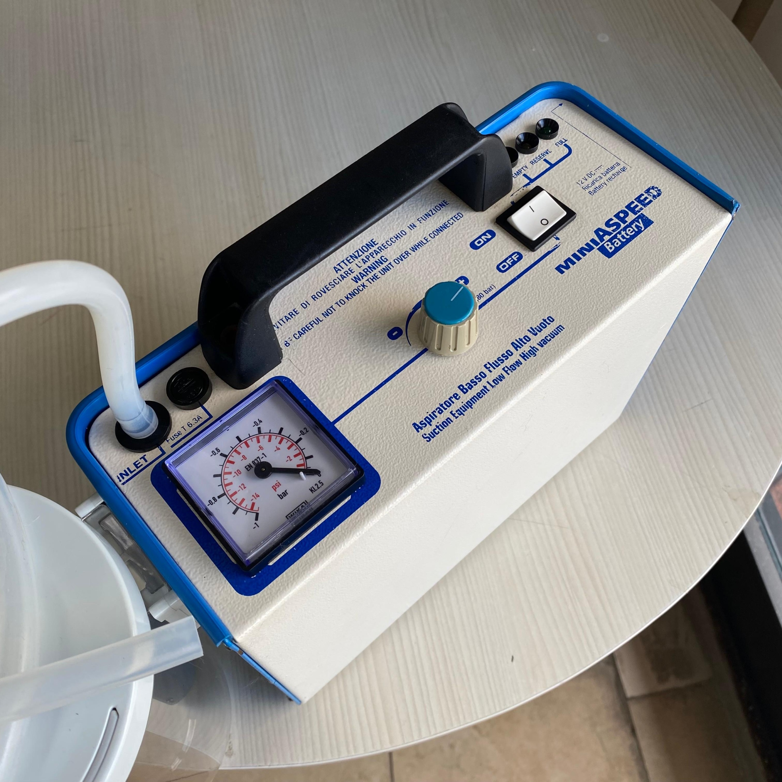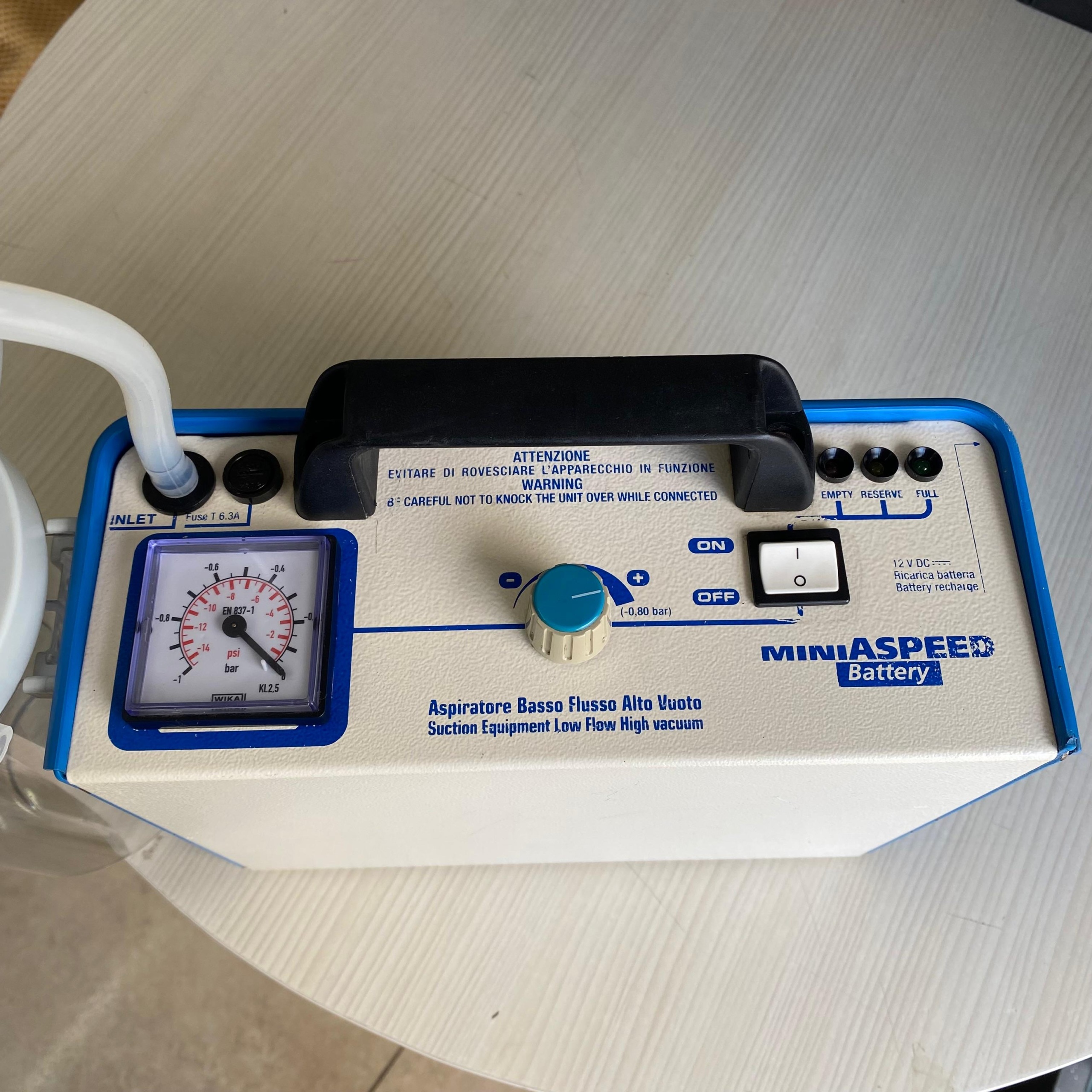 - Cihaz Marka/Model: Cihazın ana gövdesi üzerinde belirgin, büyük mavi puntolarla MINIASPEED Battery ibaresi yer almaktadır. Ayrıca cihaz üzerinde modelin sınıfını belirten “Aspiratore Basso Flusso Alto Vuoto” ve “Suction Equipment Low Flow High Vacuum” (Düşük Akış Yüksek Vakum Aspiratör) ifadeleri okunmaktadır.
