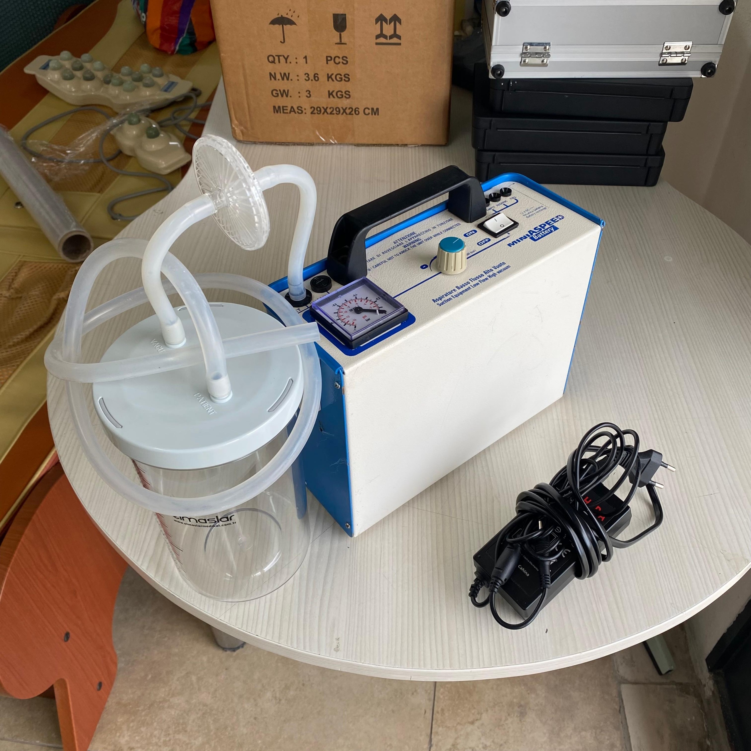 Görsellerde yer alan cihaz, tıbbi amaçla kullanılan taşınabilir bir cerrahi aspiratör (aspirasyon cihazı)dır. Cihaz, gövde, toplama kavanozu (jar), silikon hortum seti ve güç adaptörü olmak üzere tam bir set halinde görüntülenmektedir.