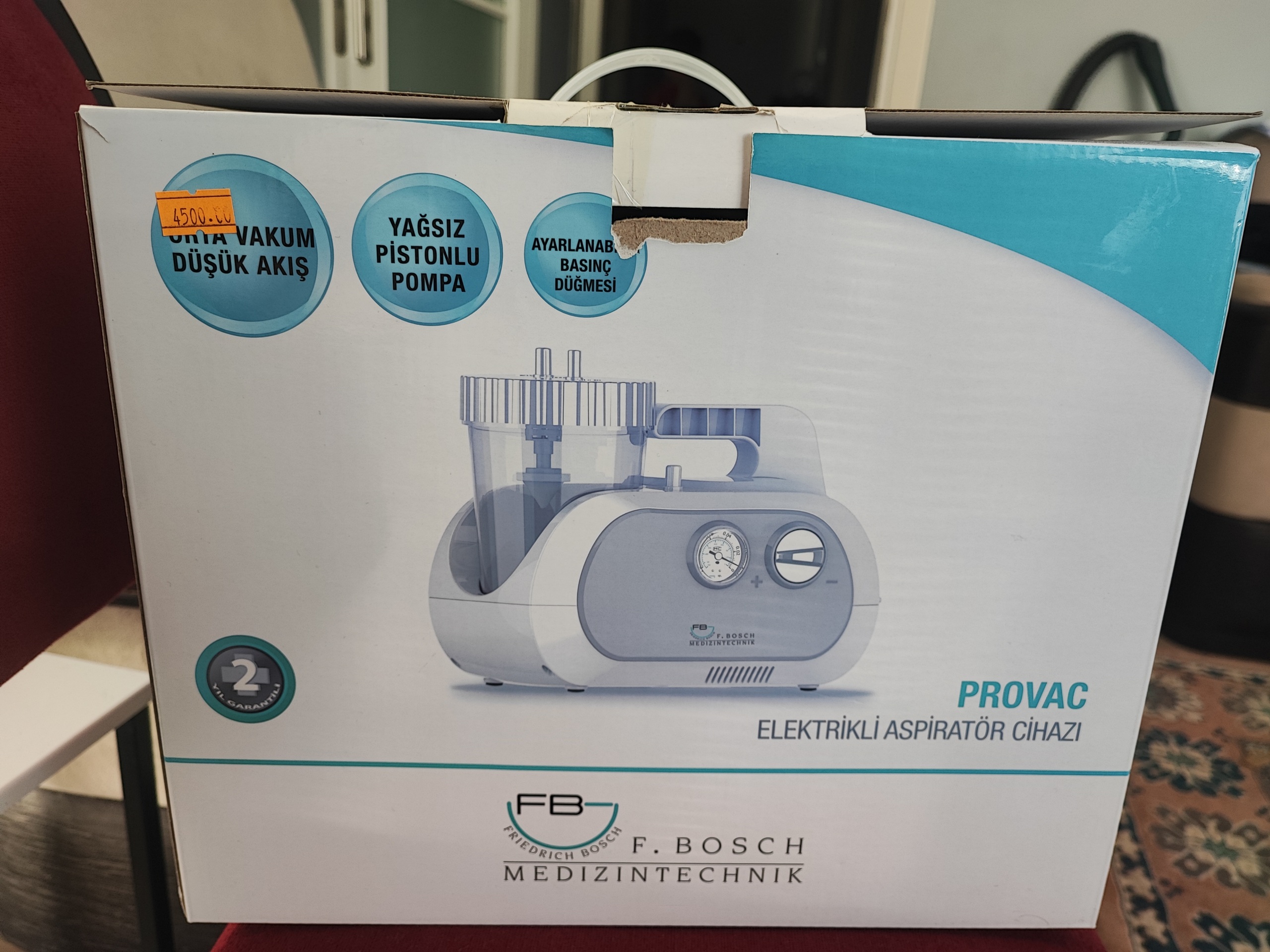 Görsellerde yer alan ürün, F. Bosch Medizintechnik markasına ait Provac model bir elektrikli aspiratör cihazıdır. Hem cihazın kendisi hem de orijinal kutusu üzerinde marka ve model bilgileri net bir şekilde okunmaktadır. Ürün, tıbbi amaçlı olarak vücut sıvılarının veya balgamın aspire edilmesi (çekilmesi) için kullanılan bir aspirasyon makinesidir. Genel olarak çok temiz ve az kullanılmış bir görünüme sahiptir.