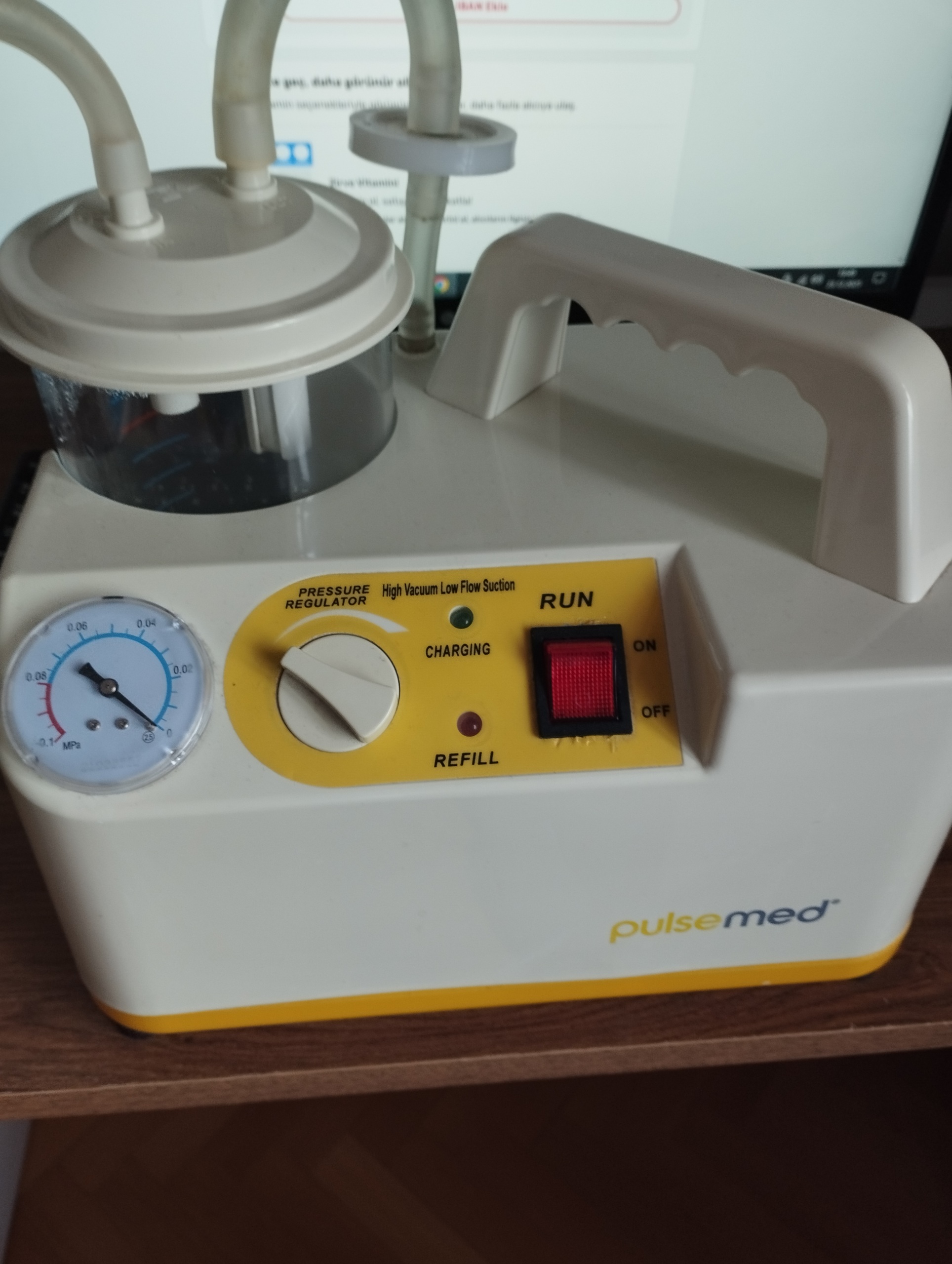 Sonuç olarak; görseldeki cihaz Pulsemed marka, bataryalı olduğu anlaşılan, fiziksel bütünlüğü korunmuş ancak sarf malzemeleri (hortum, filtre) açısından yenileme gerektirebilecek kullanılmış bir medikal aspiratördür.