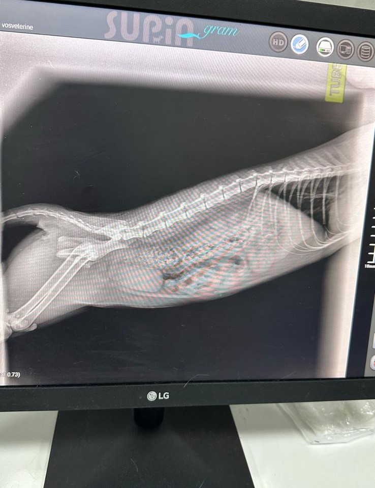 Monitör ekranında “Supia gram” yazılımının arayüzü açıktır. Sol üst köşede “vosveterine” ifadesi, sağ üst köşede ise “HD” ikonu ve çeşitli işlem butonları (döndürme, ölçüm vb.) görülmektedir. Ekranın merkezinde bir hayvanın (muhtemelen bir kedi veya küçük köpek) gövde ve arka bacak iskeletini gösteren net bir röntgen görüntüsü bulunmaktadır. Görüntünün sağ tarafında bir ölçek (10mm) yer almaktadır.