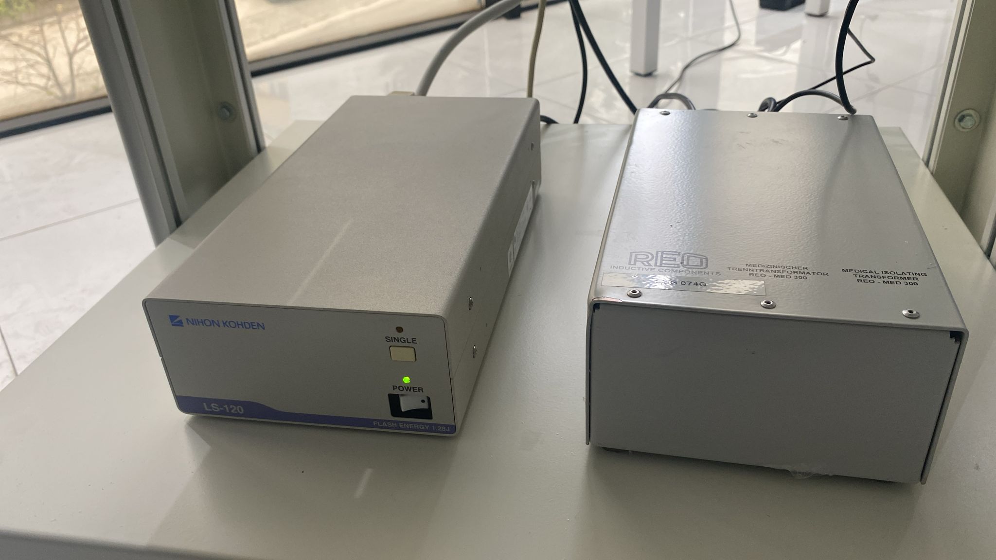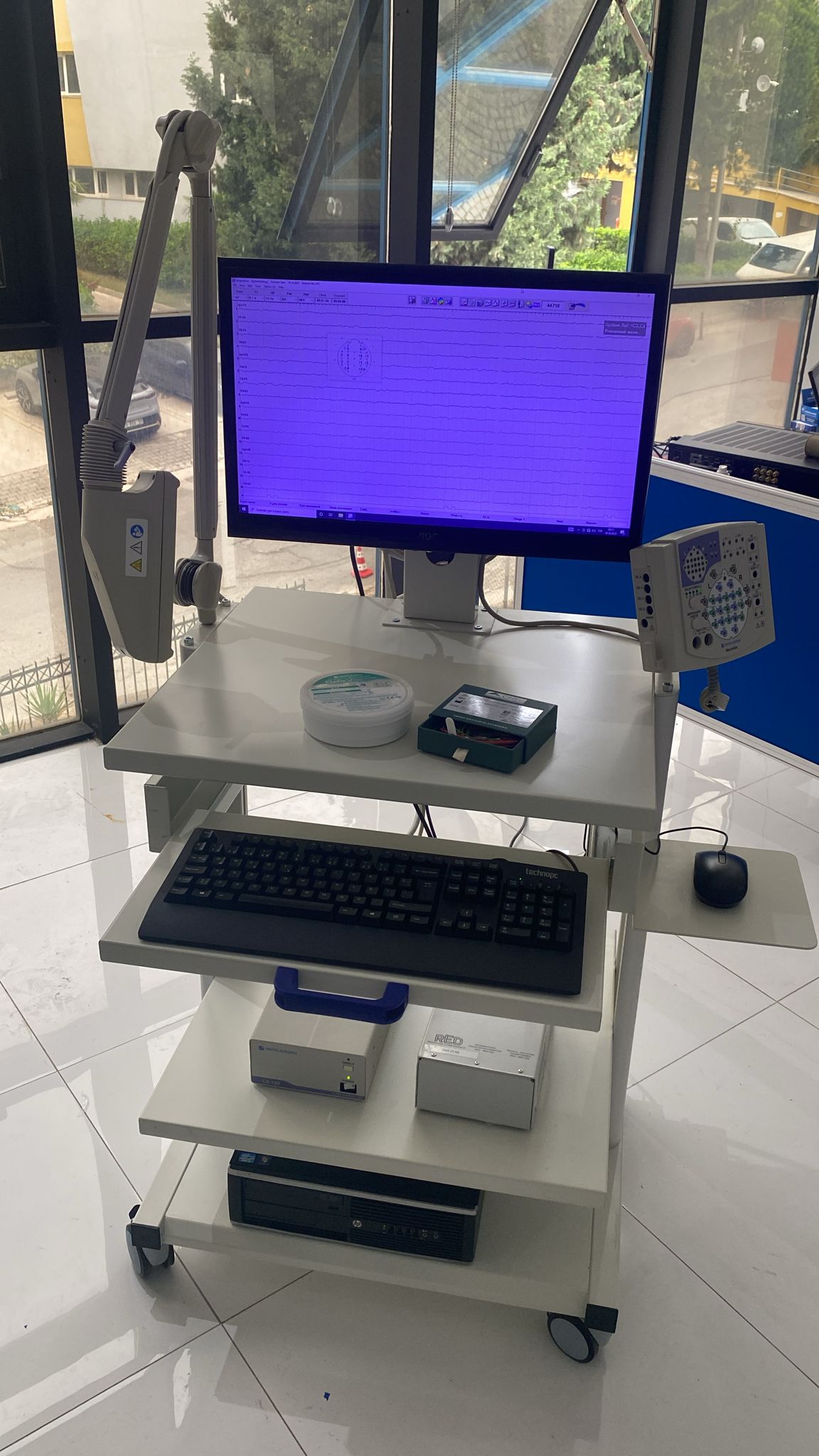 Görsellerde, beyin elektriksel aktivitesini ölçmek ve kaydetmek amacıyla kullanılan bir elektroensefalografi (EEG) sistemi bulunmaktadır. Sistem; bir hasta bağlantı modülü (amplifikatör), monitör, bilgisayar kasası, klavye, fare, fotik uyarım ünitesi ve medikal izolasyon transformatörü gibi bileşenlerden oluşmakta ve tüm bu donanımlar tekerlekli, çok katlı bir medikal araba üzerine monte edilmiştir. Cihazın genel kurulumu, klinik veya araştırma ortamlarında nörolojik teşhis ve izleme işlemleri için tasarlandığını göstermektedir.