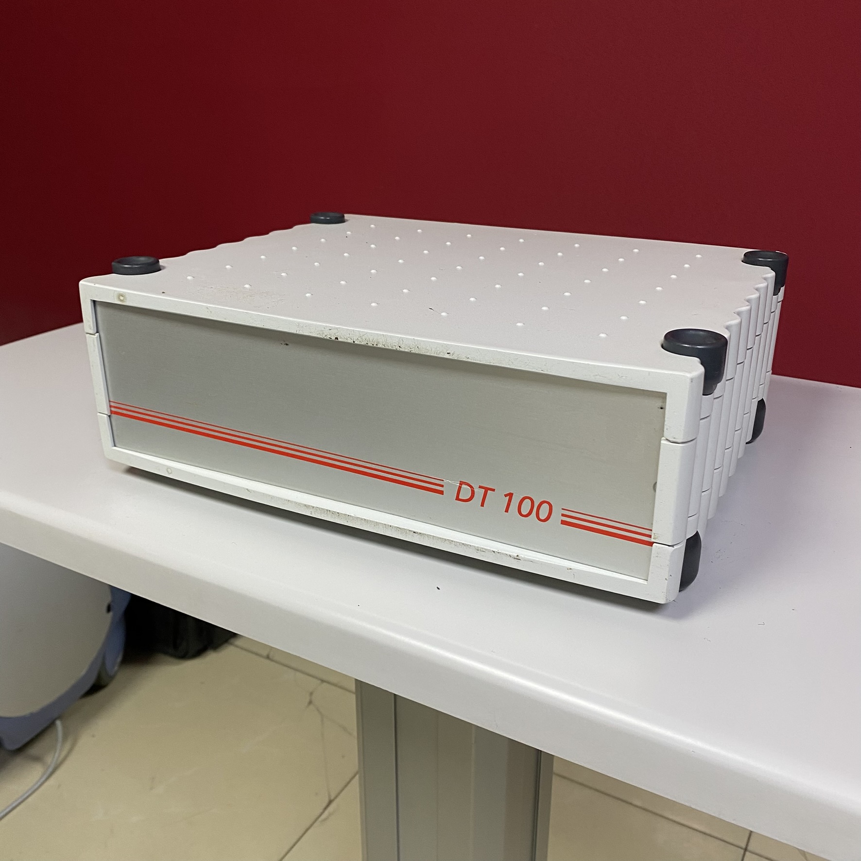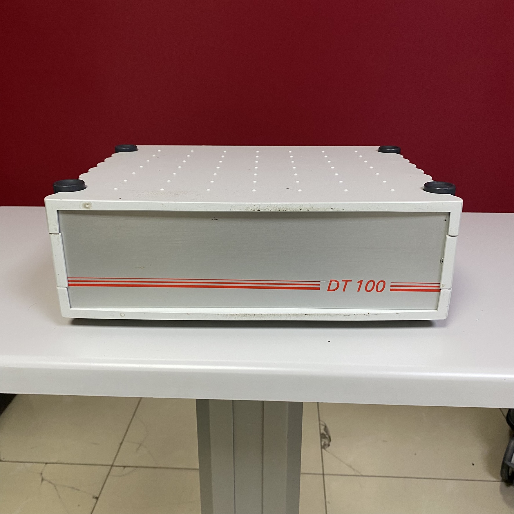 - Model Bilgisi: Ürünün ön panelinin sağ alt köşesinde, kırmızı dekoratif şeritlerin arasında kırmızı renkli harflerle net bir şekilde DT 100 ibaresi yer almaktadır. Bu ibare cihazın model kodu veya seri tanımı olarak tespit edilmiştir.