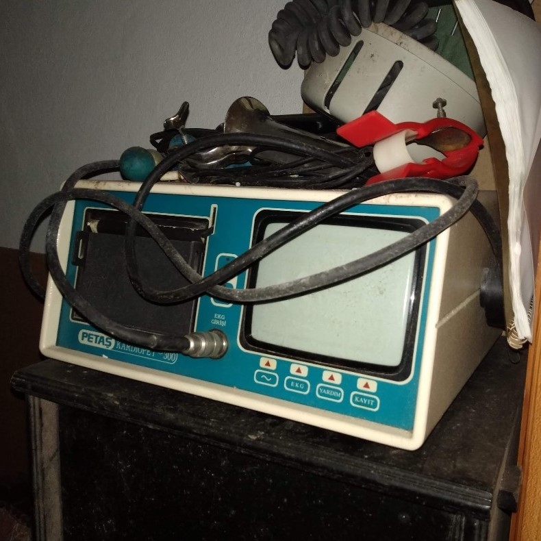 Görsellerde yer alan cihaz, üzerinde bulunan marka ve model bilgilerine göre bir Petas Kardiopet 300 modelidir. Cihazın ön panelindeki “EKG GİRİŞİ” ibaresi ve genel yapısı, ürünün tıbbi bir elektrokardiyografi (EKG) cihazı olduğunu göstermektedir. Görselde 1 adet ana ünite ve bu üniteye bağlı, uçlarında elektrot benzeri parçalar bulunan bir kablo seti bulunmaktadır. Cihazın genel görünümü, eski bir model olduğuna işaret etmektedir.
