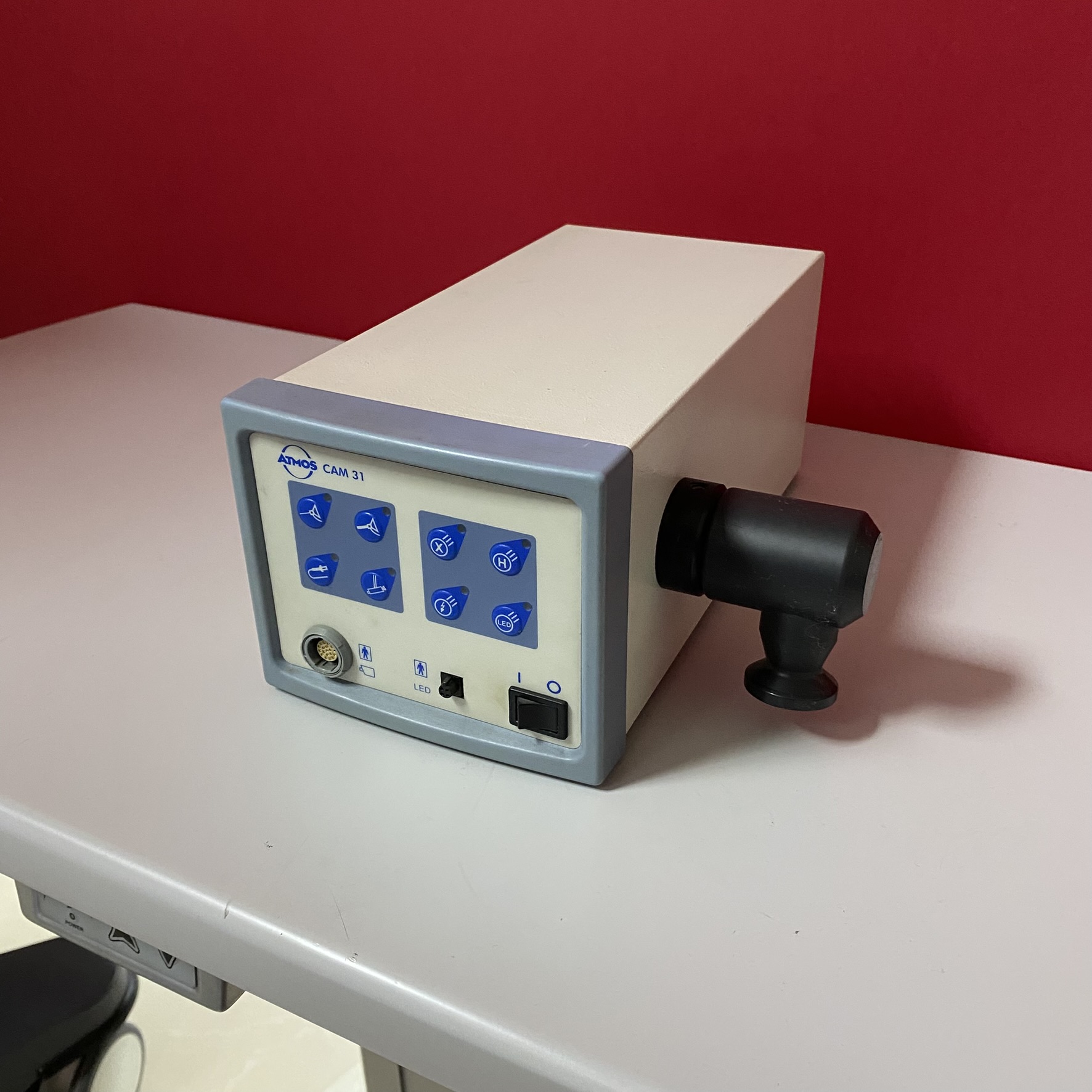 ATMOS CAM 31, endoskopik muayenelerde görüntü elde etmek amacıyla kullanılan tıbbi bir cihazdır. Ön paneldeki semboller ve bağlı olan kamera başlığı, cihazın kulak burun boğaz (KBB), jinekoloji veya genel cerrahi gibi branşlarda, tanı ve teşhis amaçlı görüntüleme işlemlerinde kullanıldığını işaret etmektedir.