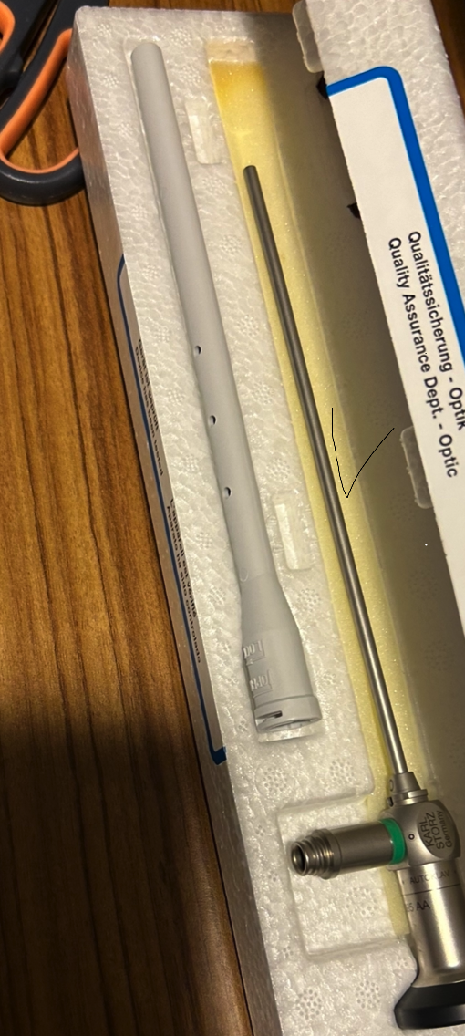 Görsellerde yer alan ürün, tıbbi görüntüleme ve cerrahi müdahalelerde kullanılan profesyonel bir rijit endoskop (tıbbi optik/teleskop) cihazıdır. Cihaz, vücut içindeki bölgelerin görüntülenmesini sağlayan optik sistemden ve bu optiği saklamak için kullanılan koruyucu bir tüpten oluşmaktadır.