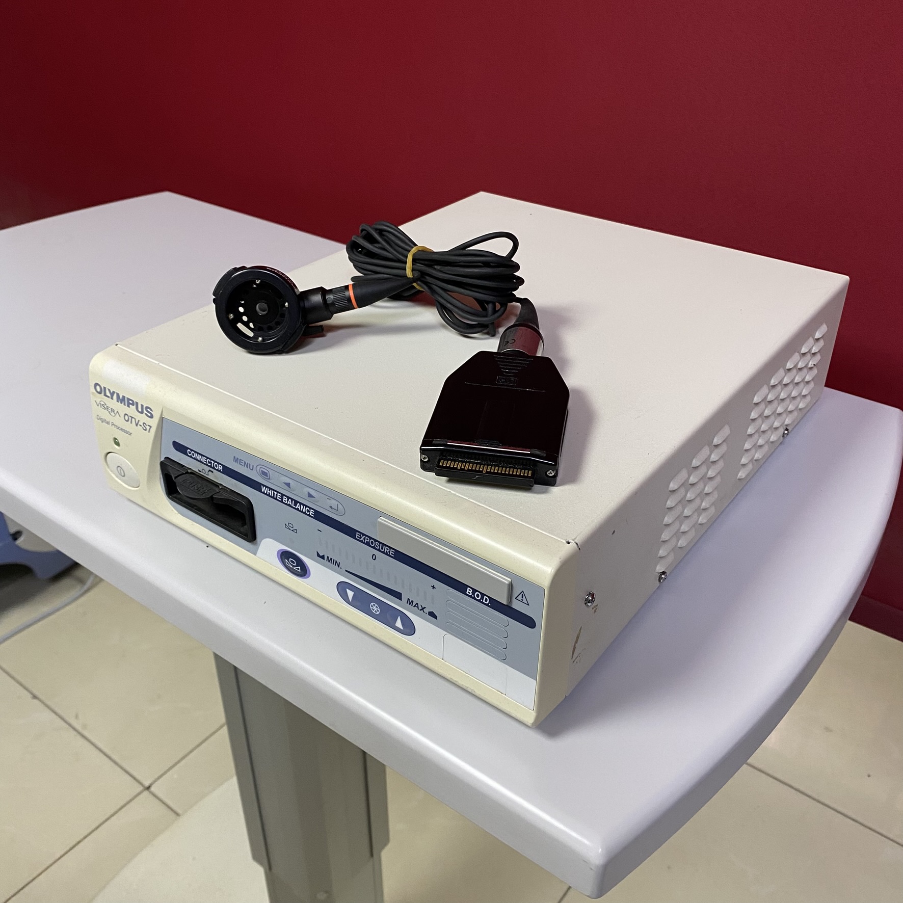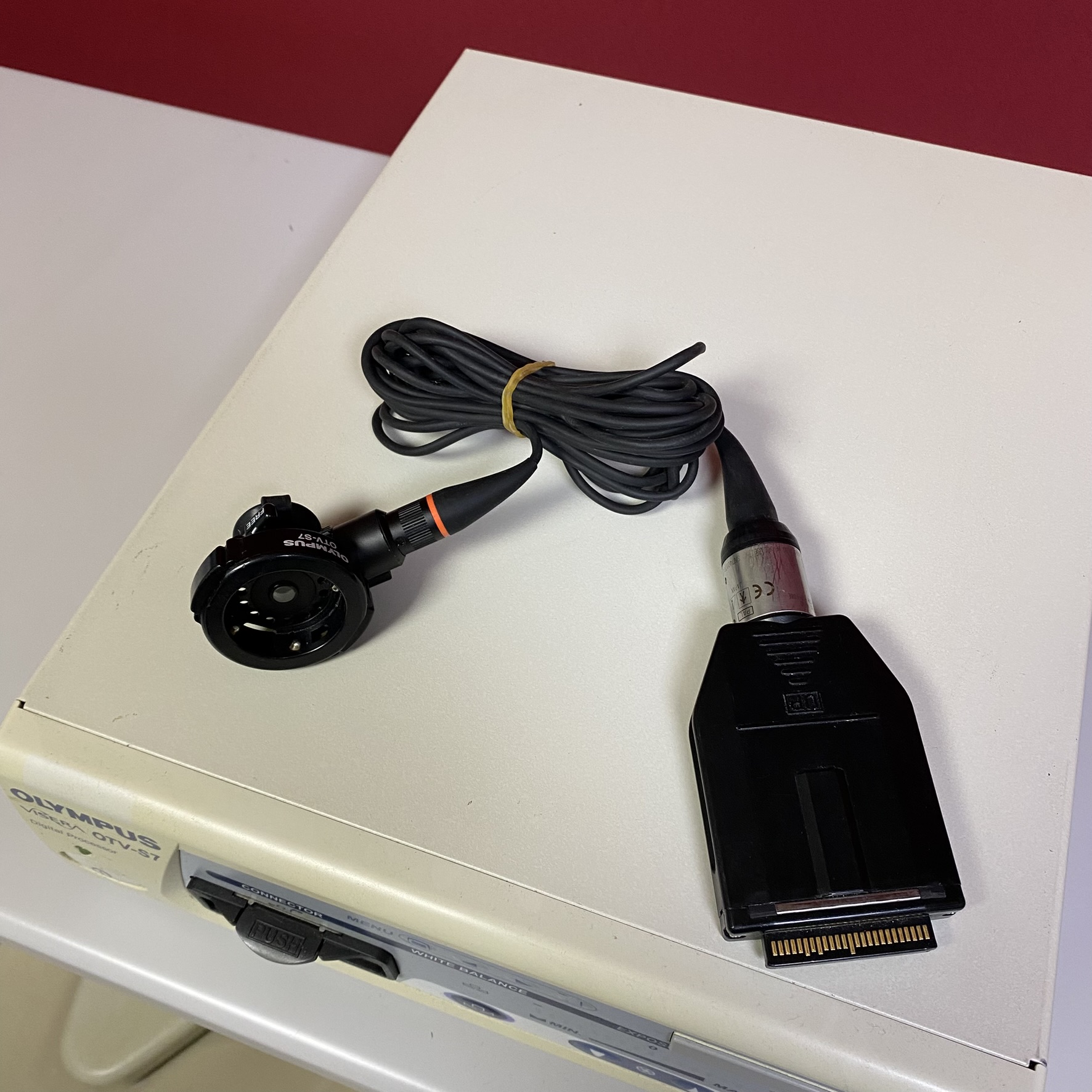 Olympus Visera OTV-S7, genel cerrahi, üroloji, jinekoloji ve gastroenteroloji gibi branşlarda gerçekleştirilen endoskopik işlemlerde kullanılır. Bu cihazın temel görevi, hastanın içine gönderilen endoskop kamerasından gelen sinyalleri işleyerek monitöre aktarmaktır. Görseldeki kamera başlığı endoskopa bağlanır, ana ünite ise görüntünün rengini, ışığını ve netliğini ayarlar.