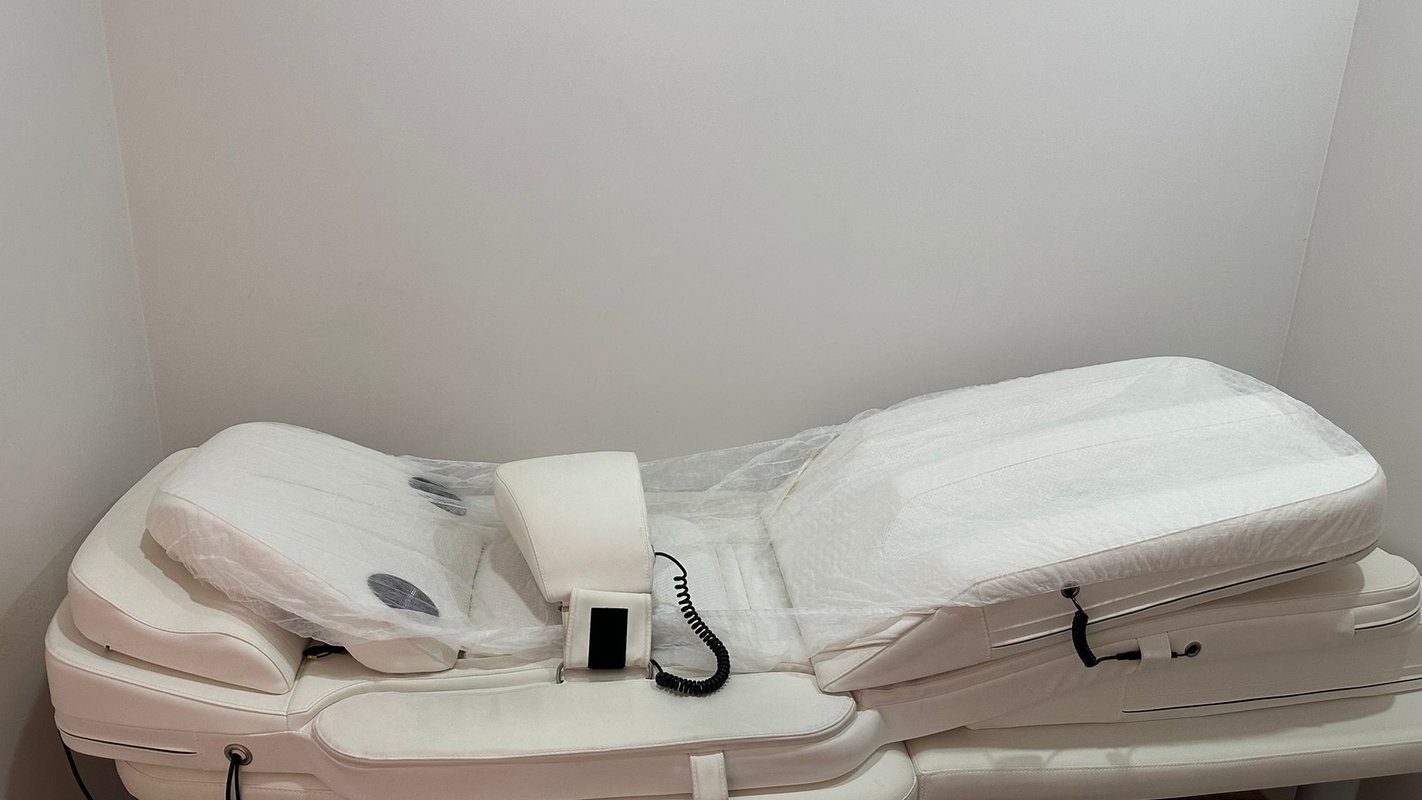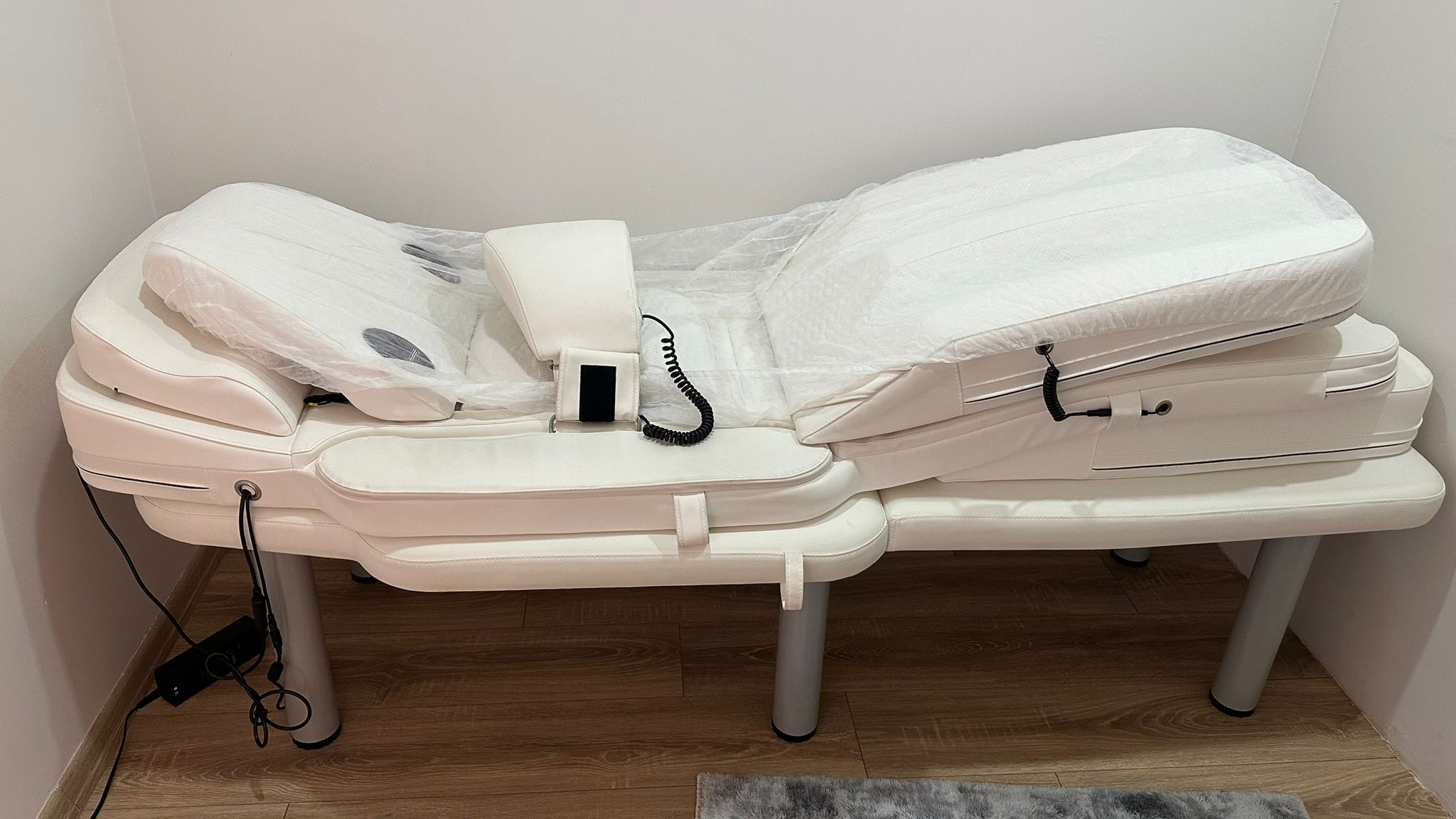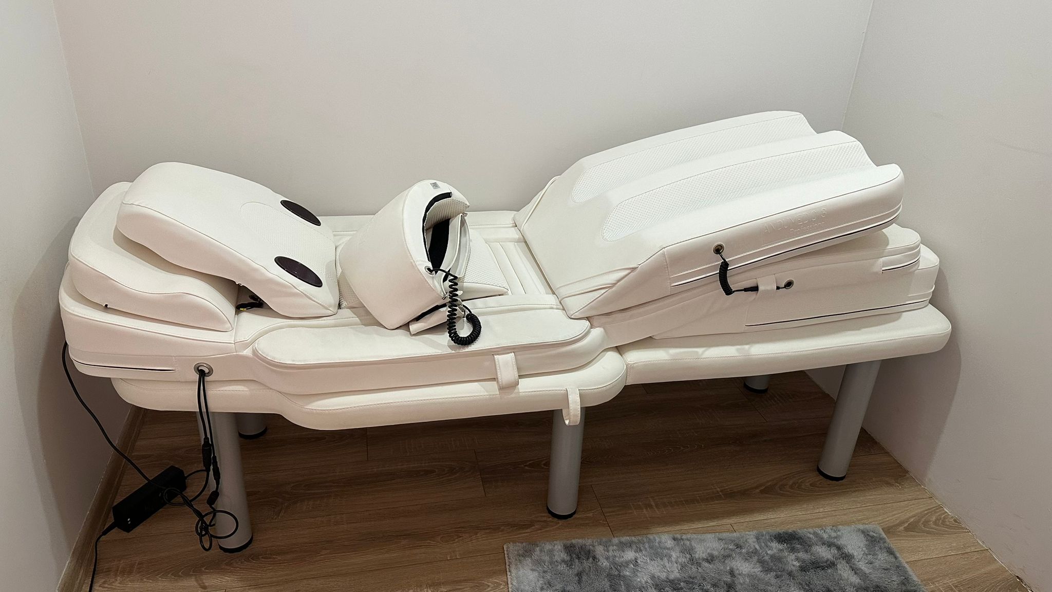 Görsellerde, birden fazla bölümden oluşan, beyaz renkli, suni deri kaplı bir masaj ve terapi yatağı bulunmaktadır. Ürün, ayarlanabilir modüllere, bir kumandaya ve bir güç adaptörüne sahiptir. Andulasyon terapi sistemi olarak bilinen, mekanik titreşim ve kızılötesi ısıyı birleştiren bir tedavi yönteminde kullanıldığı anlaşılmaktadır. Cihaz, evde veya profesyonel ortamlarda kas gevşetme, rahatlama ve ağrı giderme gibi amaçlarla tasarlanmıştır.