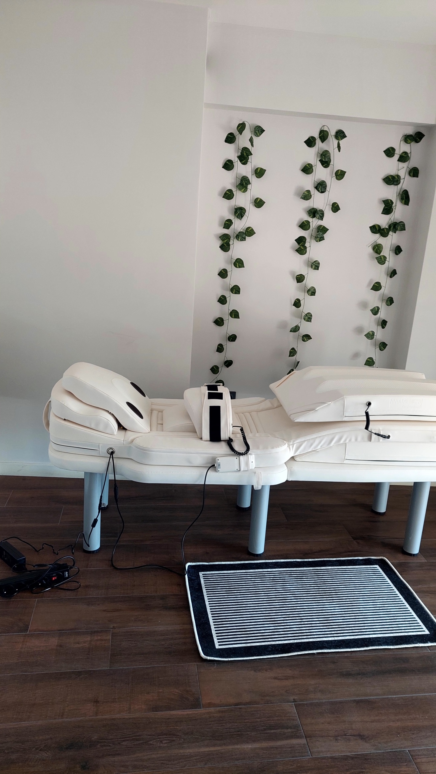 İncelenen görseller, medikal wellness ve fizyoterapi alanlarında kullanılan profesyonel bir andulasyon terapi sistemine aittir. Sistem; titreşim ve kızılötesi ısı teknolojilerini birleştiren ergonomik bir yatak, tedavi kemerleri ve kontrol ünitesinden oluşan bütünleşik bir yapıdadır.