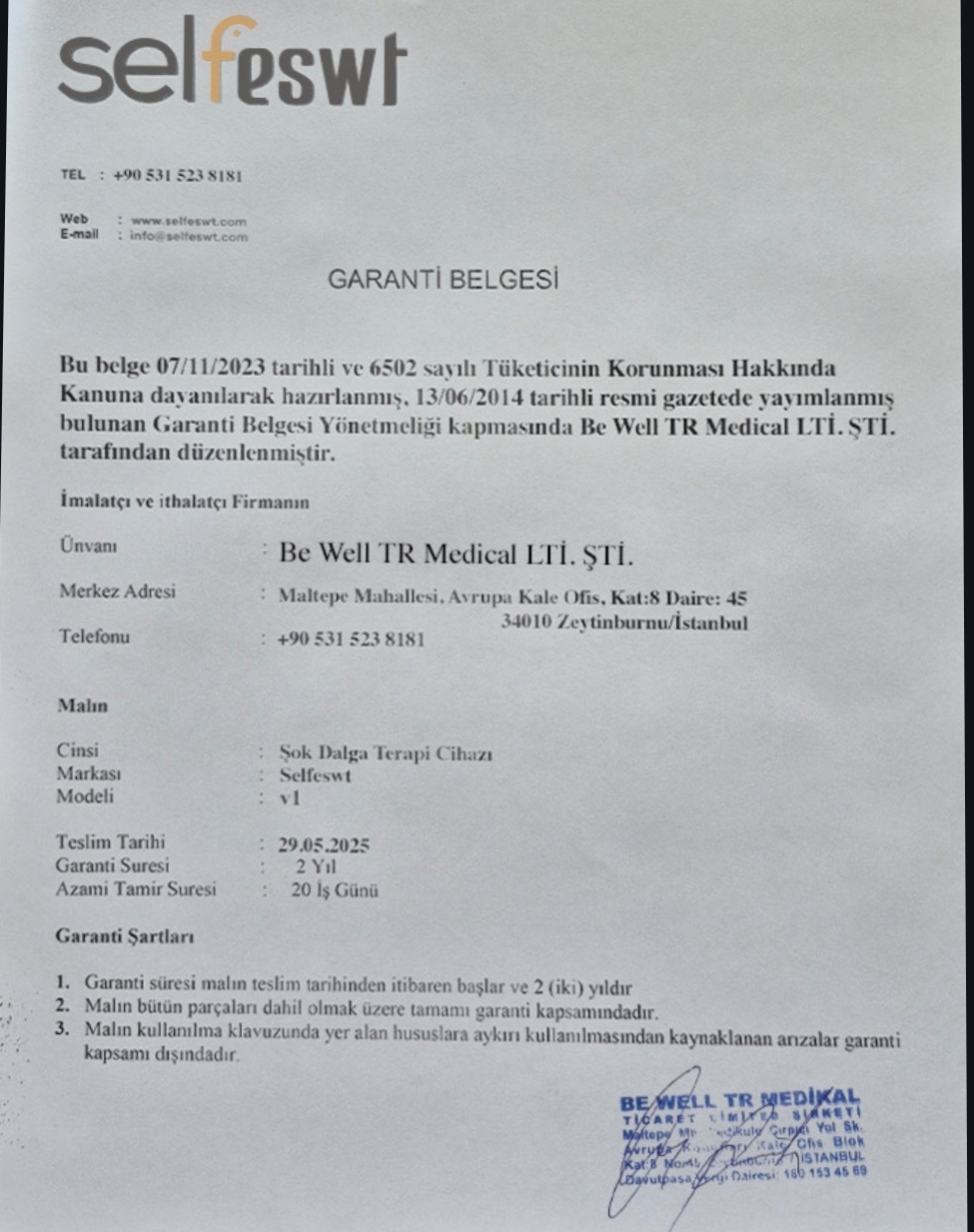 Görseller arasında cihaza ait bir garanti belgesi bulunmaktadır. Belge üzerinde yer alan bilgilere göre, cihazın teslim tarihi 29.05.2025 olup, bu tarihten itibaren 2 yıl süreyle garanti kapsamındadır. Belgeye göre cihazın garantisi devam etmektedir. Garanti belgesi Be Well TR Medical LTI. ŞTİ. tarafından düzenlenmiştir.
