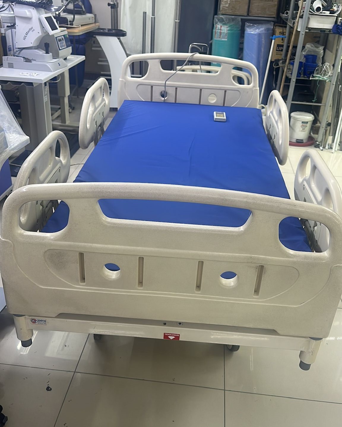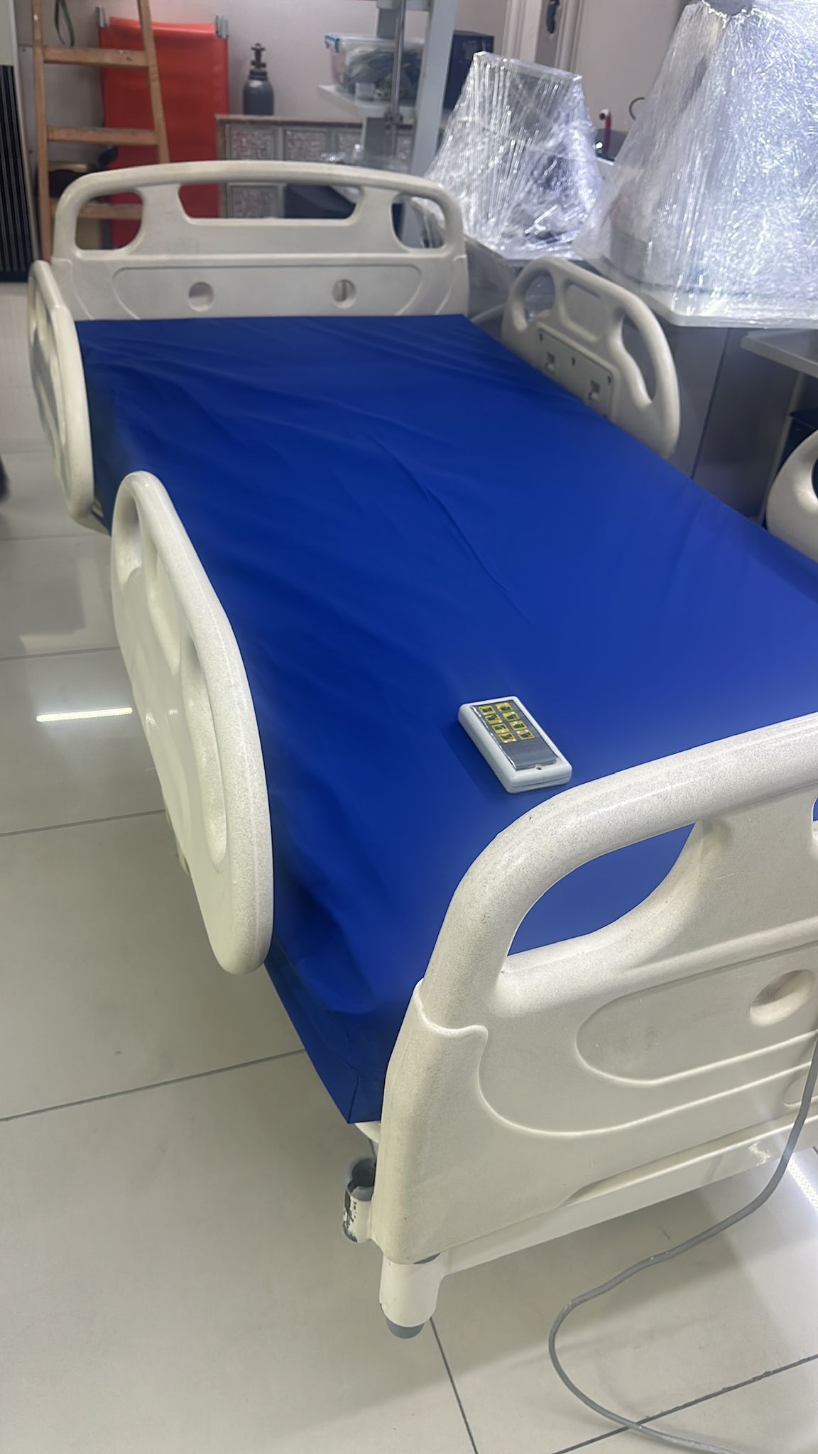 Görsellerde, motorlu ve tekerlekli bir hasta karyolası ile üzerinde mavi renkli kılıflı bir yatak ve bir adet kablolu el kumandası görülmektedir.