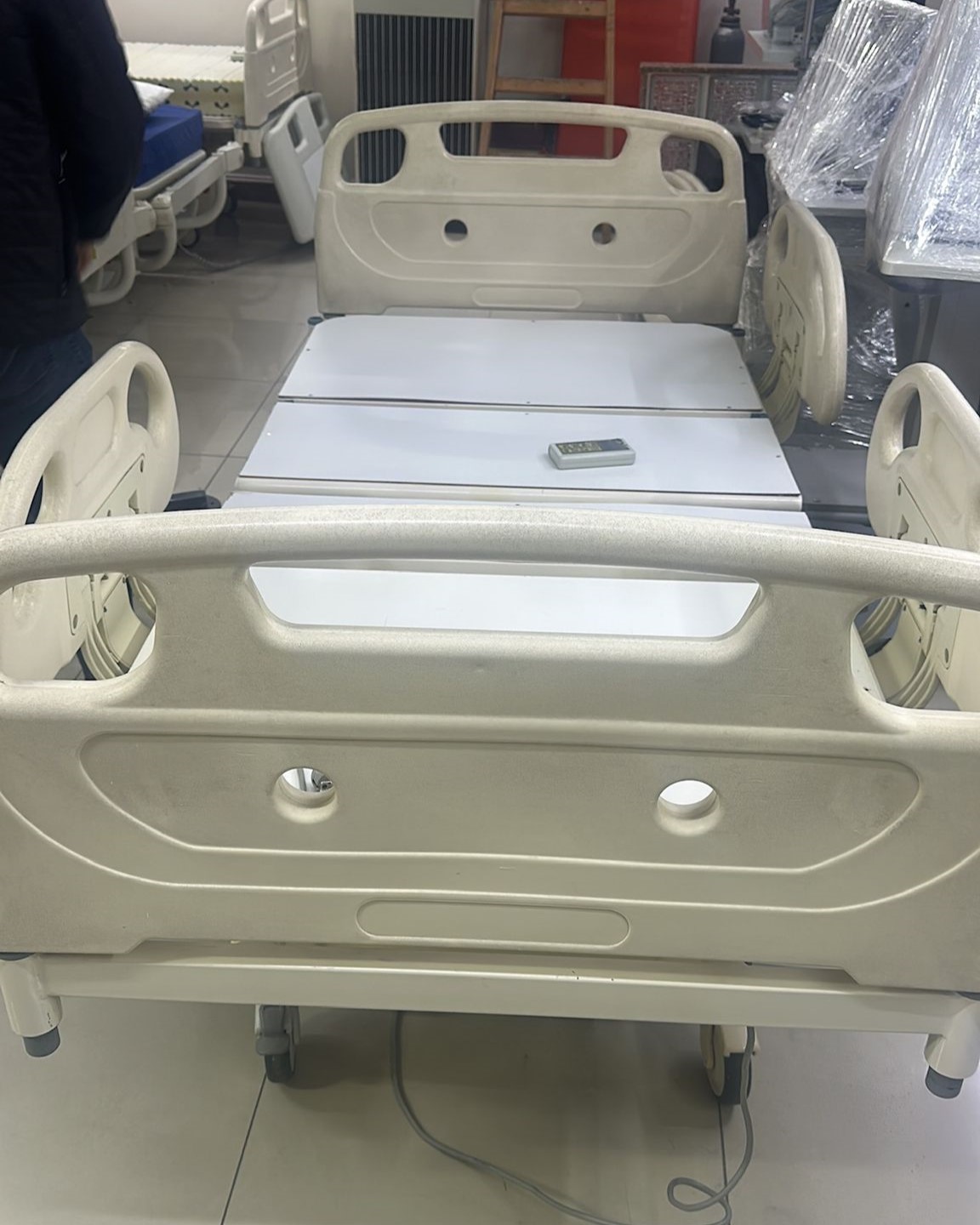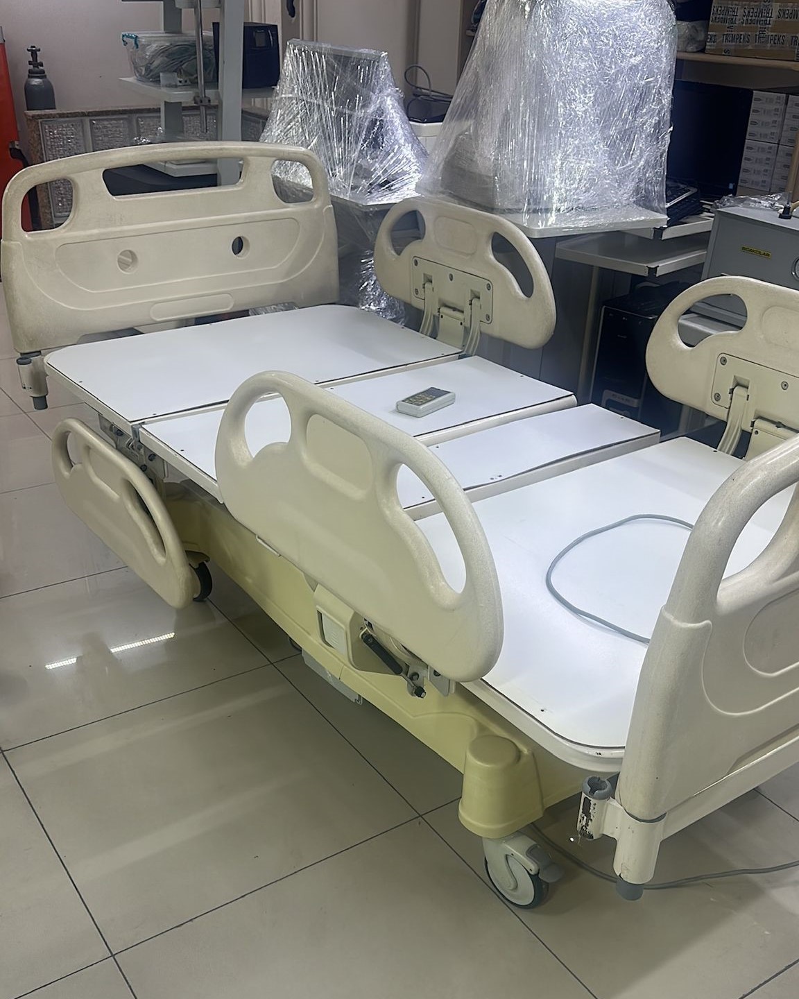 Görsellerde toplam 1 adet hasta karyolası, 1 adet hasta yatağı ve 1 adet el kumandası bulunmaktadır.
