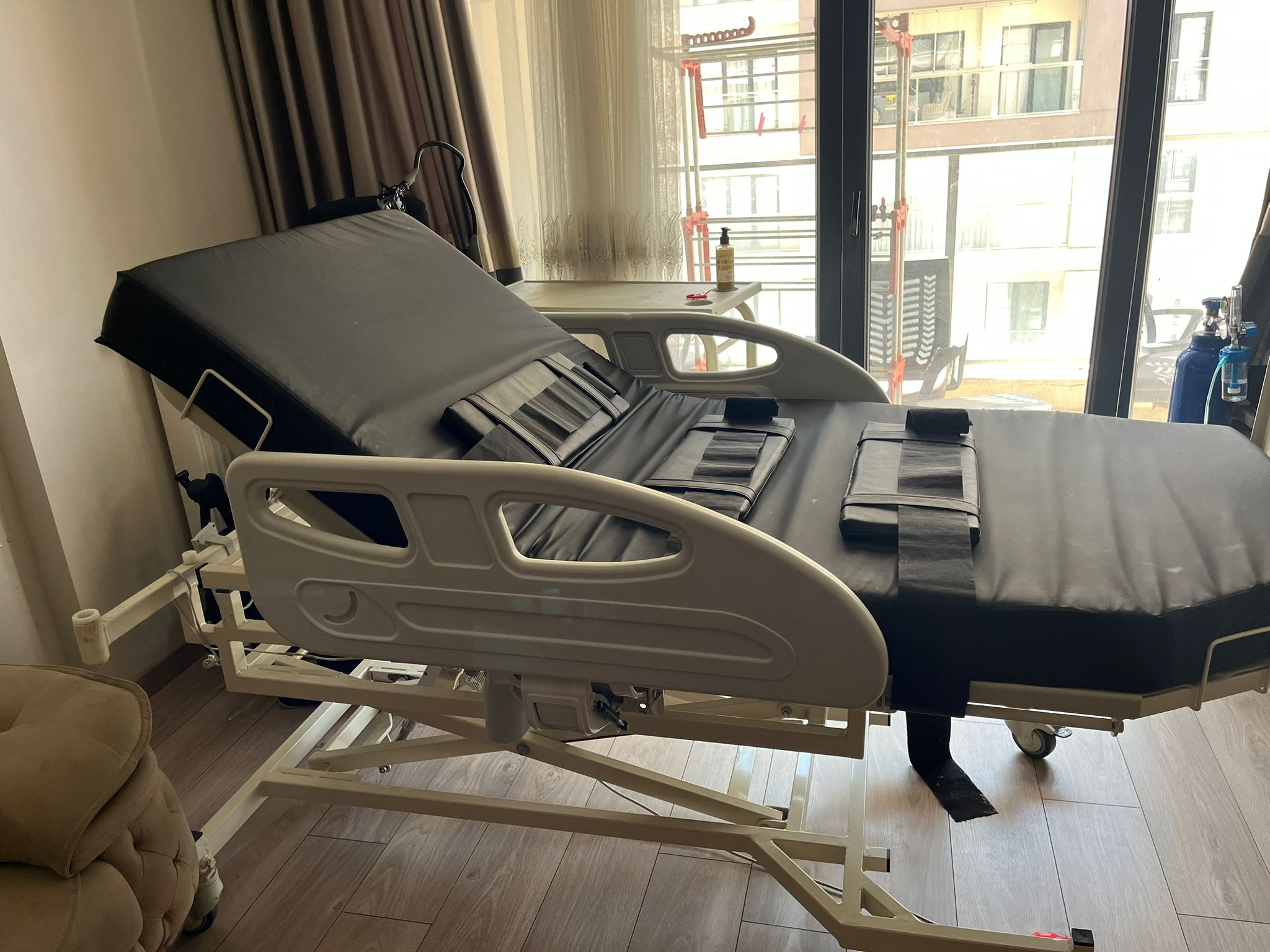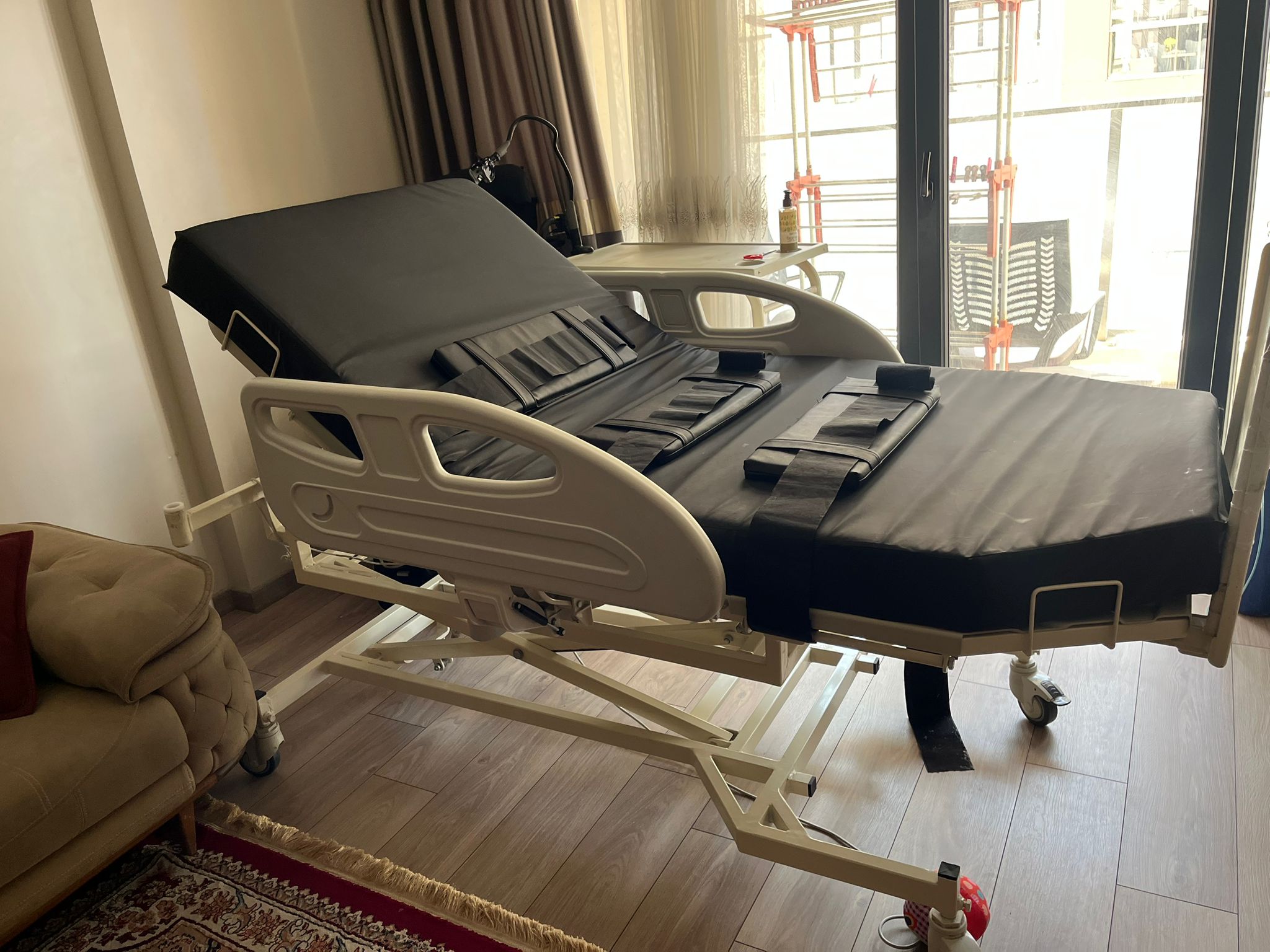 - Sabitleme Kayışları: Yatağın orta ve ayak bölümlerinde, hastayı veya yatağı sabitlemek amacıyla kullanılan siyah renkli geniş kayışlar mevcuttur.
