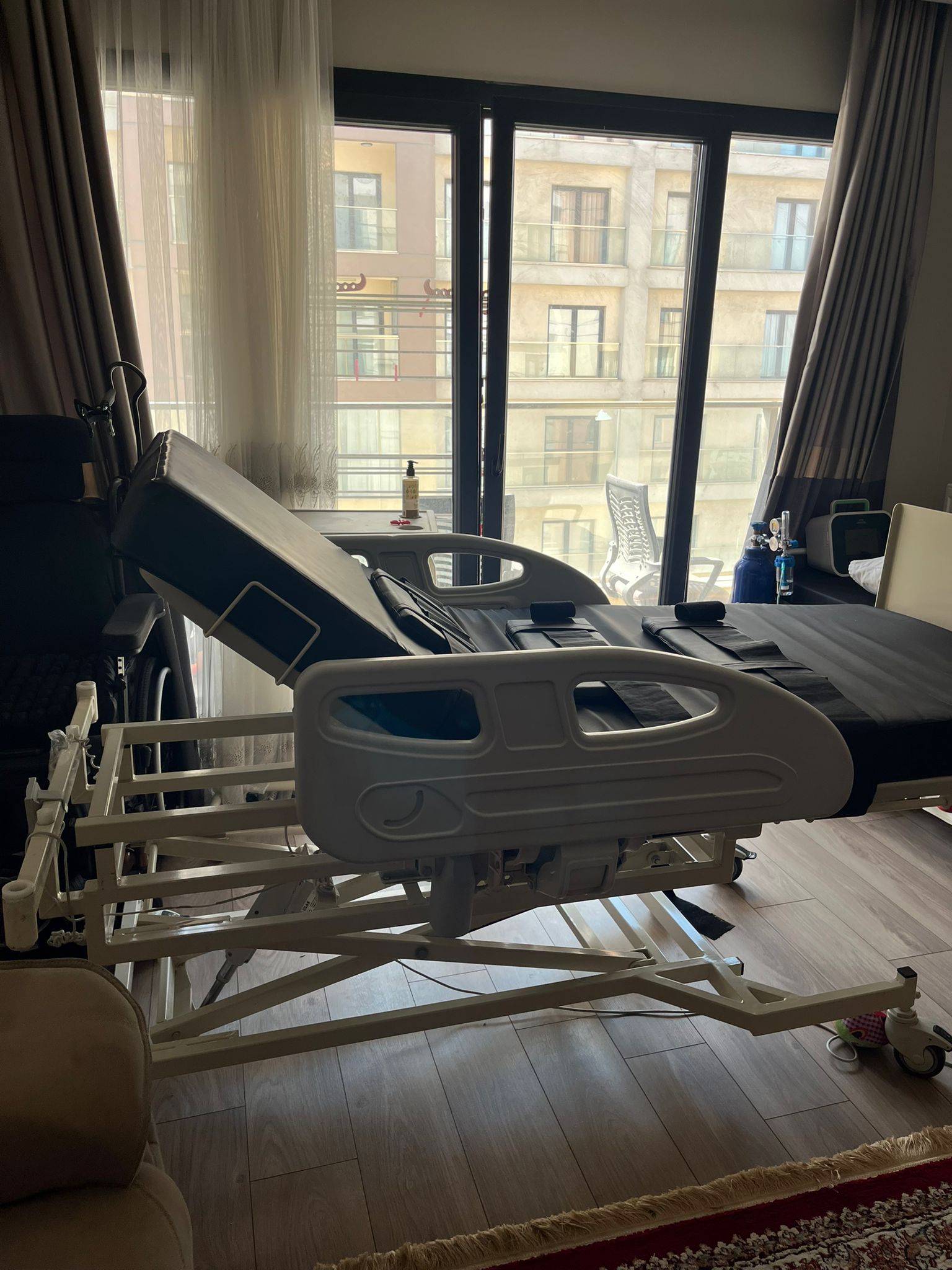 Görsellerde bir adet elektrikli hasta karyolası ve üzerinde konumlandırılmış bir adet hasta yatağı tespit edilmiştir.