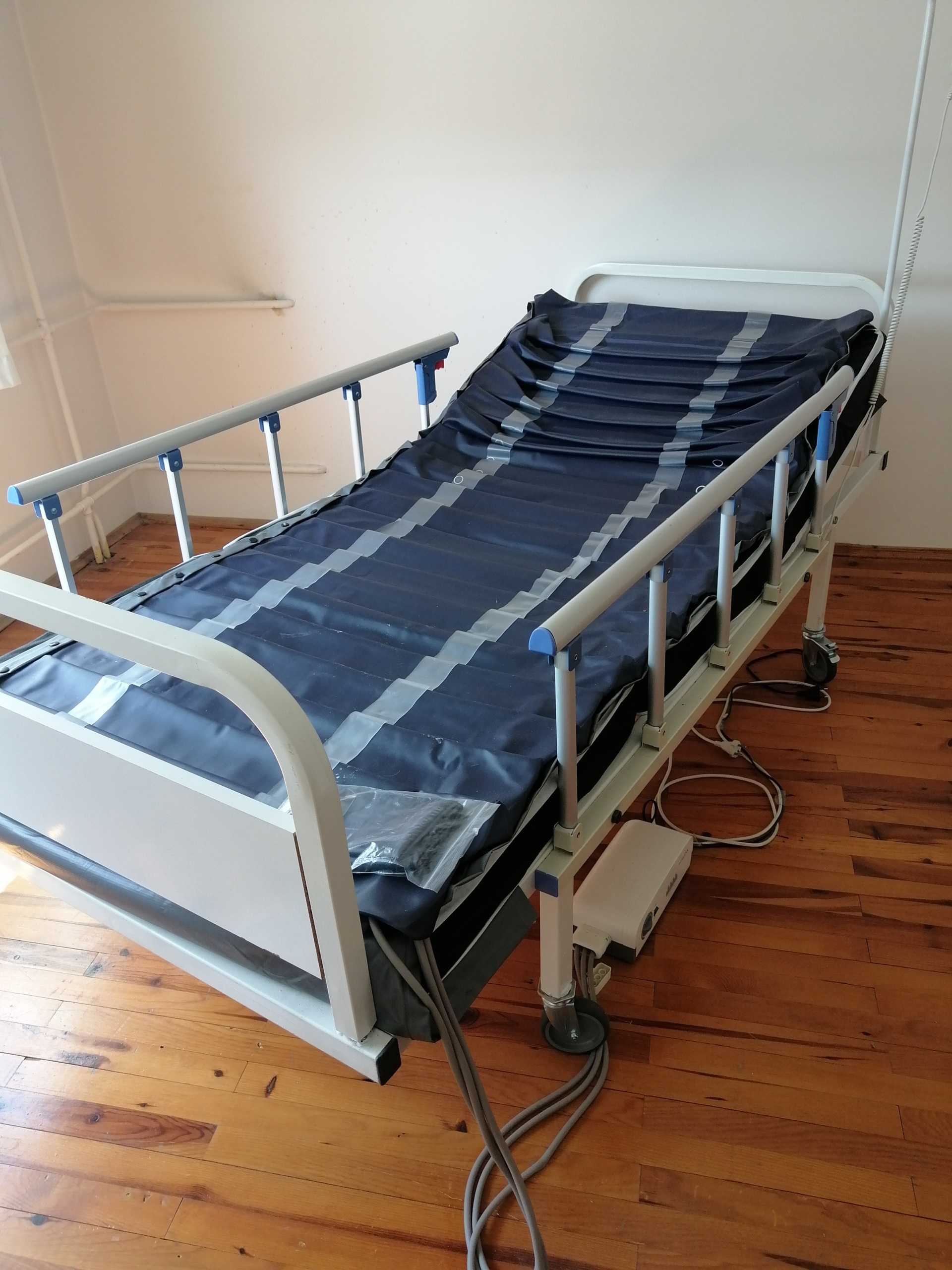 Elektronik aksamı temsil eden Galena marka hava pompasının dış kasası sağlam durumdadır. Üzerindeki güç düğmesi “ON” (Açık) konumundadır ve yeşil ışığı yanmaktadır, bu da cihaza enerji geldiğini ve çalıştığını göstermektedir. Ayrıca, basınç ayarı için bir döner düğme ve basınç seviyesini gösteren bir panel bulunmaktadır. Pompadan yatağa uzanan hava hortumları sağlam görünmektedir. Karyolanın mekanik aksamı olan tekerlekler ve yan korkuluklarda herhangi bir mekanik sorun göze çarpmamaktadır.
