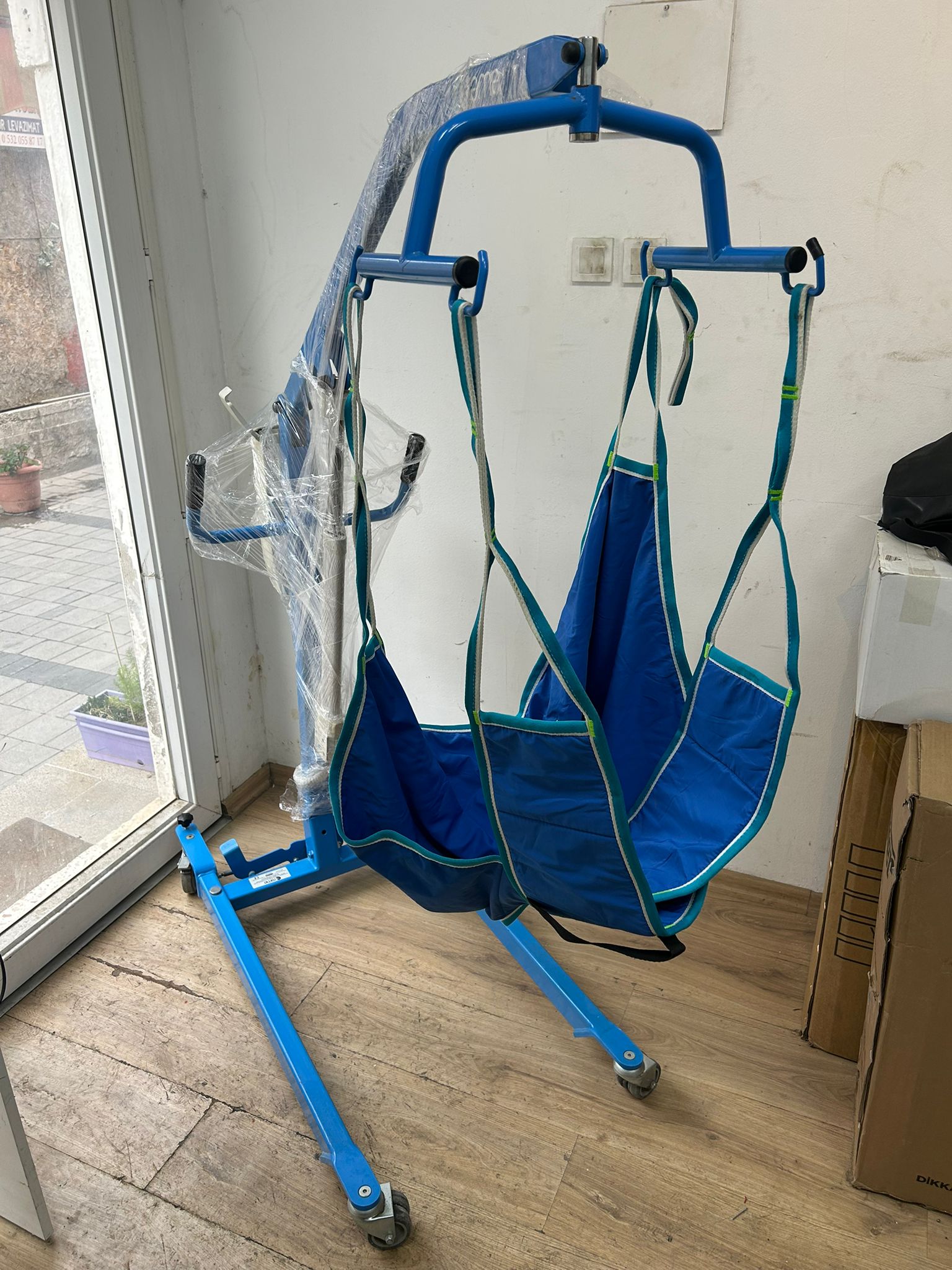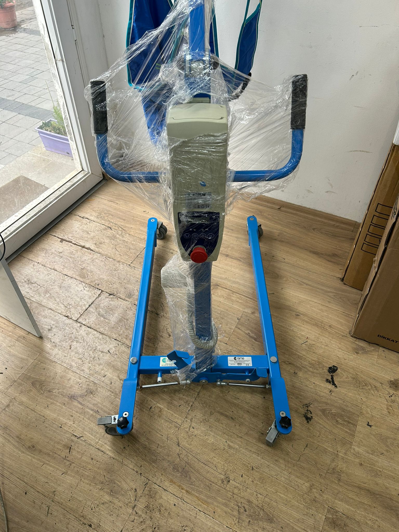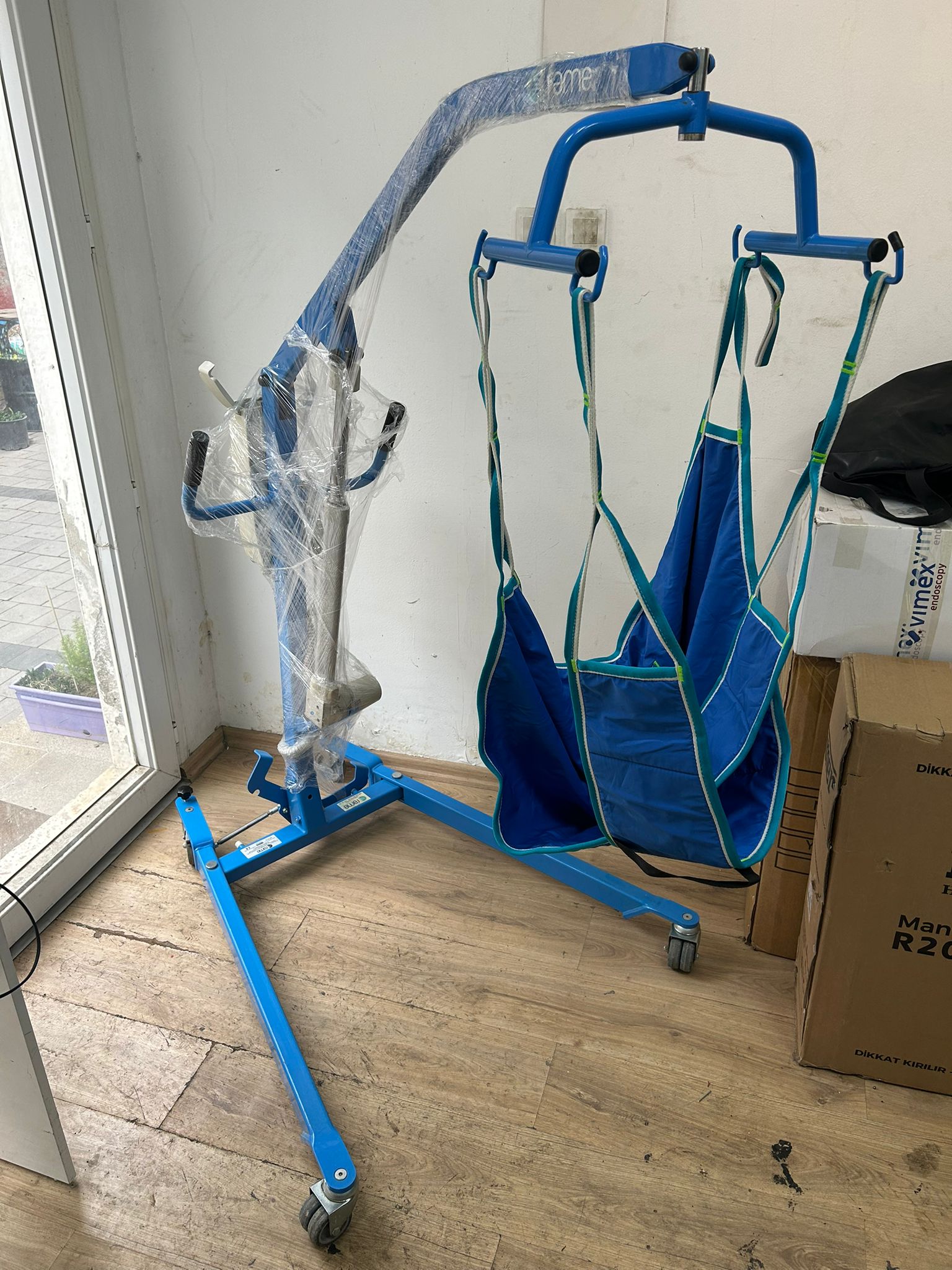 Görsellerdeki ürün, motorlu bir hasta taşıma lifti ve bu lifte ait şarj edilebilir batarya, şarj istasyonu, el kumandası ve taşıma sapanından oluşmaktadır.