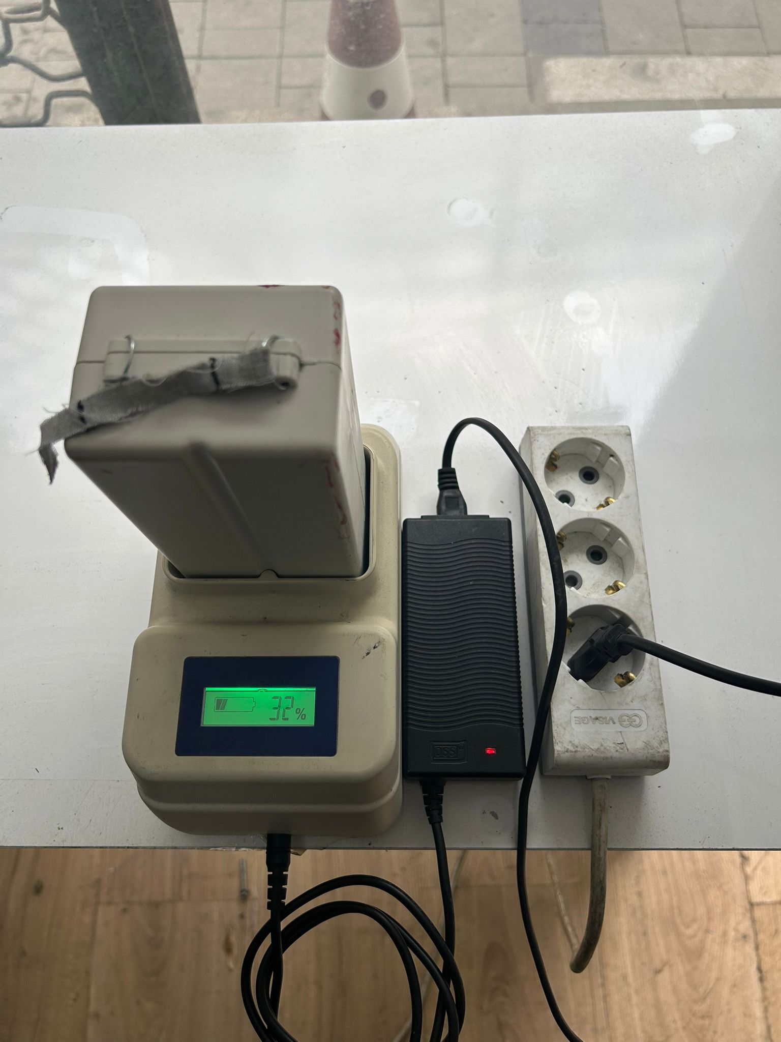 Cihazın harici bataryası şarj ünitesine yerleştirilmiş durumdadır. Şarj ünitesinin ön yüzeyinde yeşil aydınlatmalı bir LCD ekran bulunmaktadır. Ekran aktiftir ve üzerinde dolum aşamasını gösteren bir batarya simgesi ile birlikte 32% ibaresi yer almaktadır. Bu veri, bataryanın şarj alabildiğini ve anlık doluluk oranını göstermektedir. Batarya kasasında dışa doğru bir şişme veya kimyasal akıntı gözlemlenmemiştir.