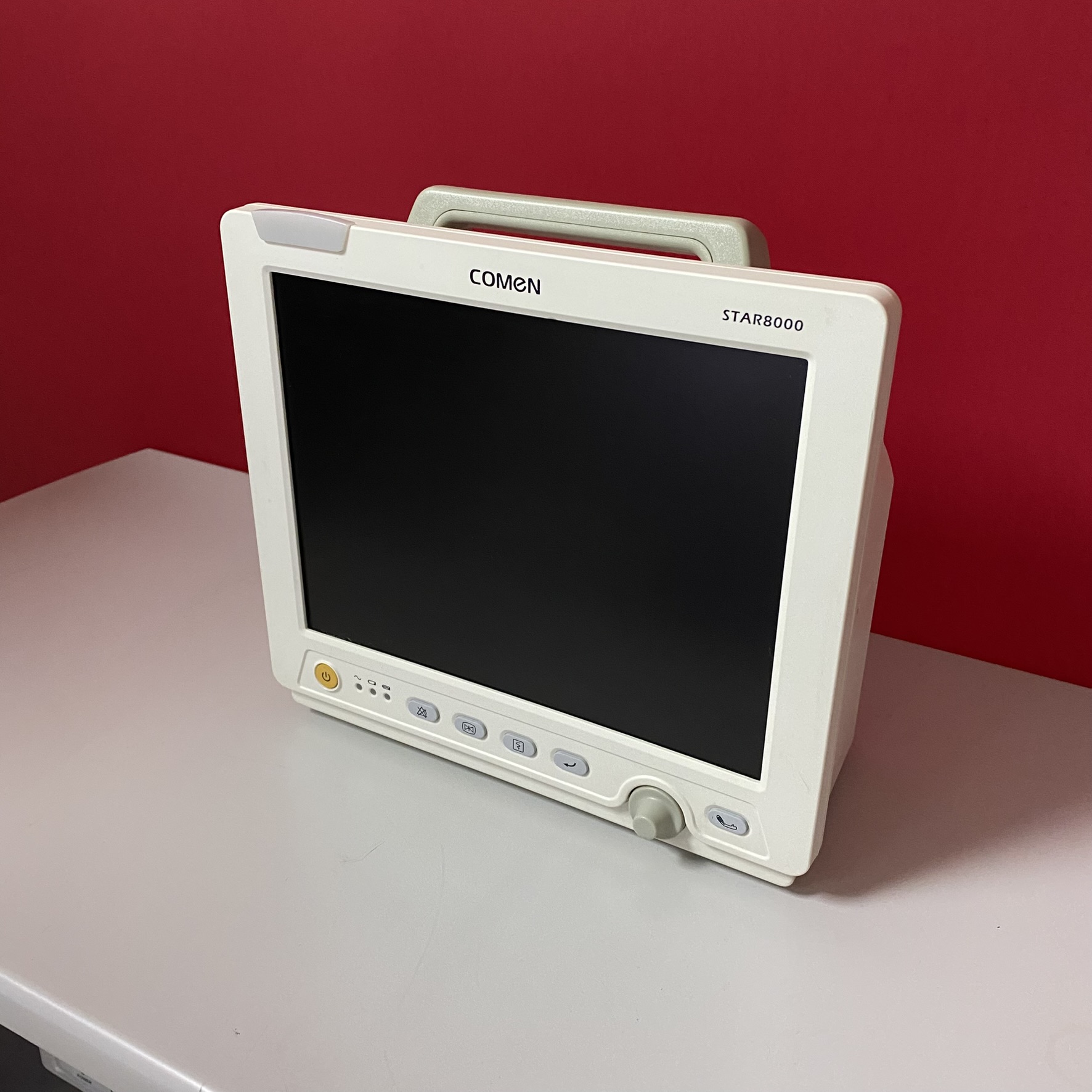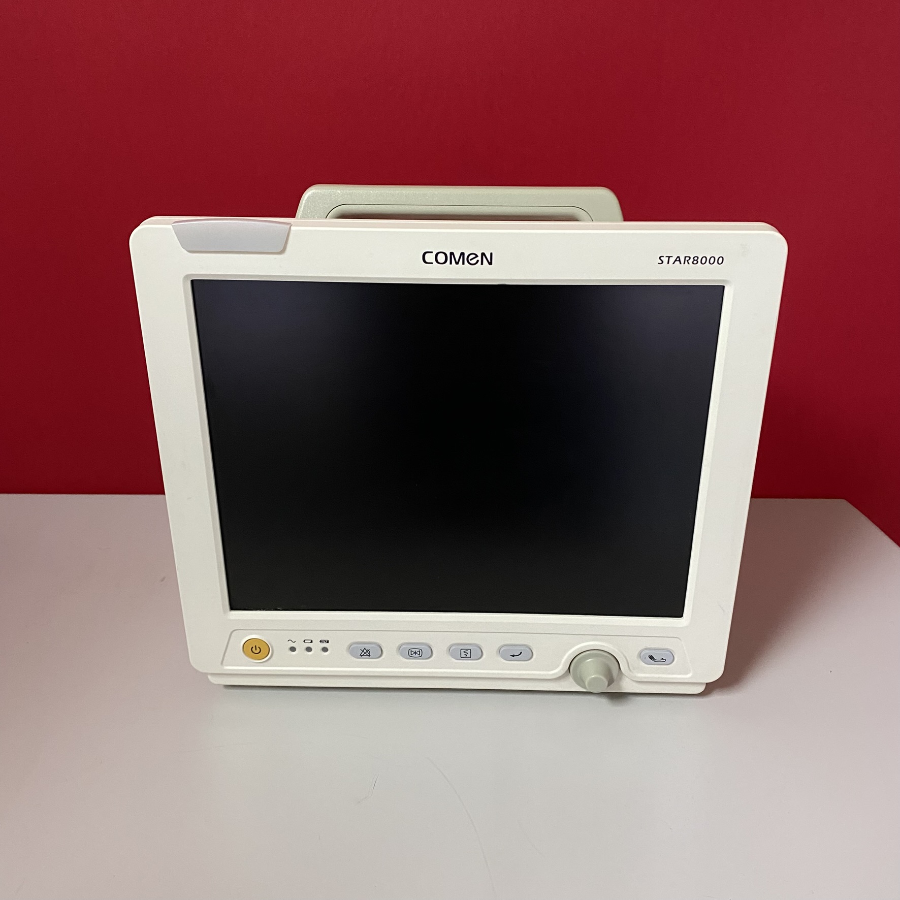 İncelenen görsellerdeki cihaz, tıbbi alanda kullanılan profesyonel bir medikal izleme ekipmanıdır. Cihazın ön yüzeyinde üst orta kısımda net bir şekilde COMEN markası, üst sağ köşede ise STAR8000 model numarası görülmektedir. Cihazın karakteristik yapısı, taşıma kulpu ve arayüz butonları, bunun bir “Çok Parametreli Hasta Başı Monitörü” olduğunu teyit etmektedir.
