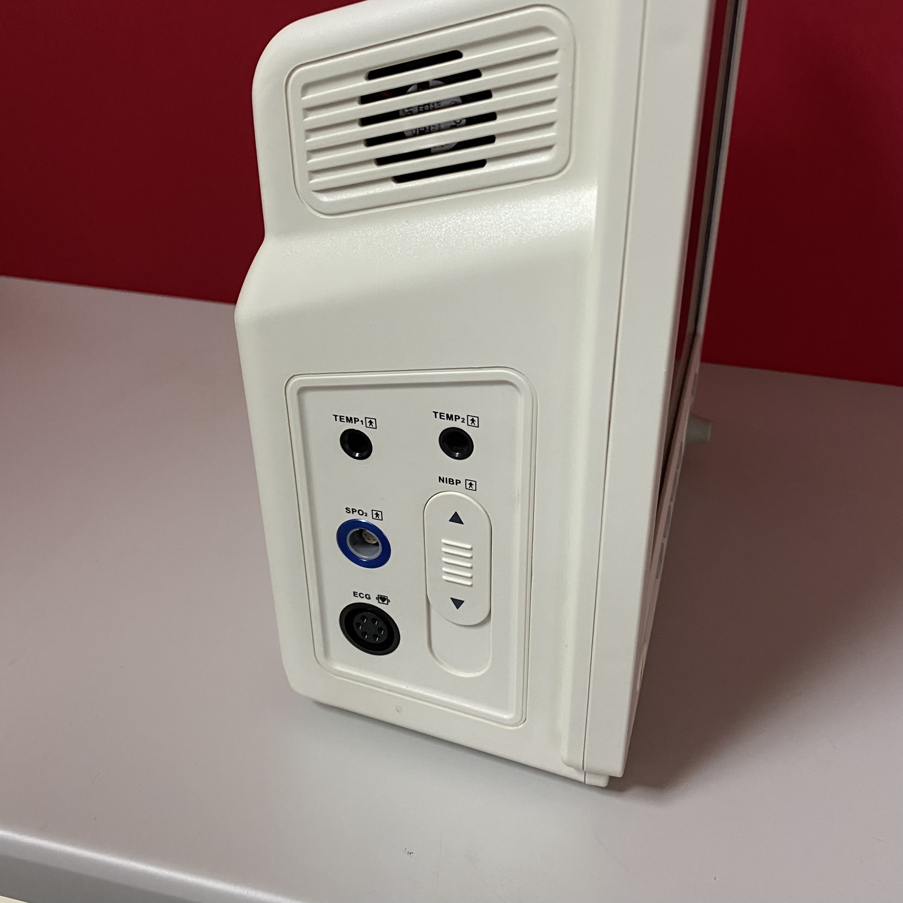 Cihazın yan paneli (Görsel 3) detaylıca incelendiğinde, bu monitörün hasta vital bulgularını ölçmek için kullanılan standart girişlere sahip olduğu görülmektedir. Port girişleri ve üzerindeki etiketler şunlardır: