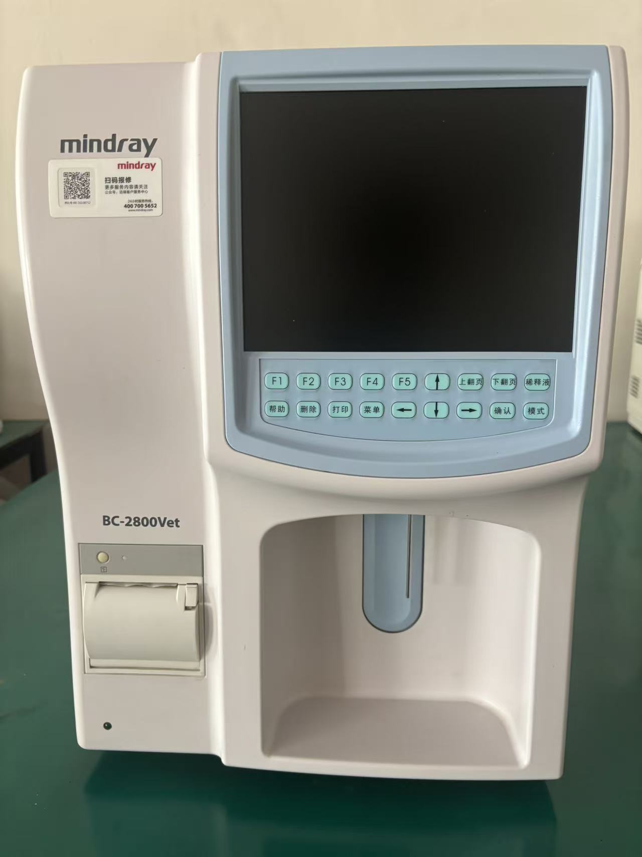 Görsellerde yer alan cihaz, veterinerlik alanında kullanılmak üzere tasarlanmış bir tam otomatik hematoloji analiz (kan sayım) cihazıdır. Ürünün markası, cihazın ön ve yan yüzeyinde net bir şekilde okunabilen Mindray, modeli ise yine ön yüzünde belirtilen BC-2800Vet‘tir. Bu cihaz, veteriner klinikleri ve laboratuvarlarında hayvanlardan alınan kan örneklerini analiz ederek kan hücrelerini sayma ve farklılaştırma işlevi görür. Cihazın genel tasarımı, logo ve model yazılarının kalitesi, ürünün orijinal olduğunu düşündürmektedir.