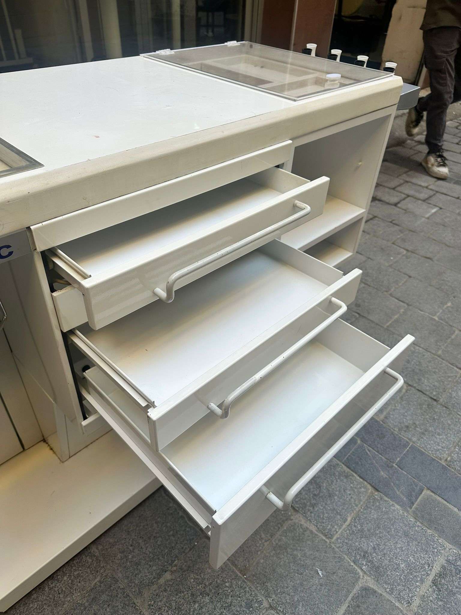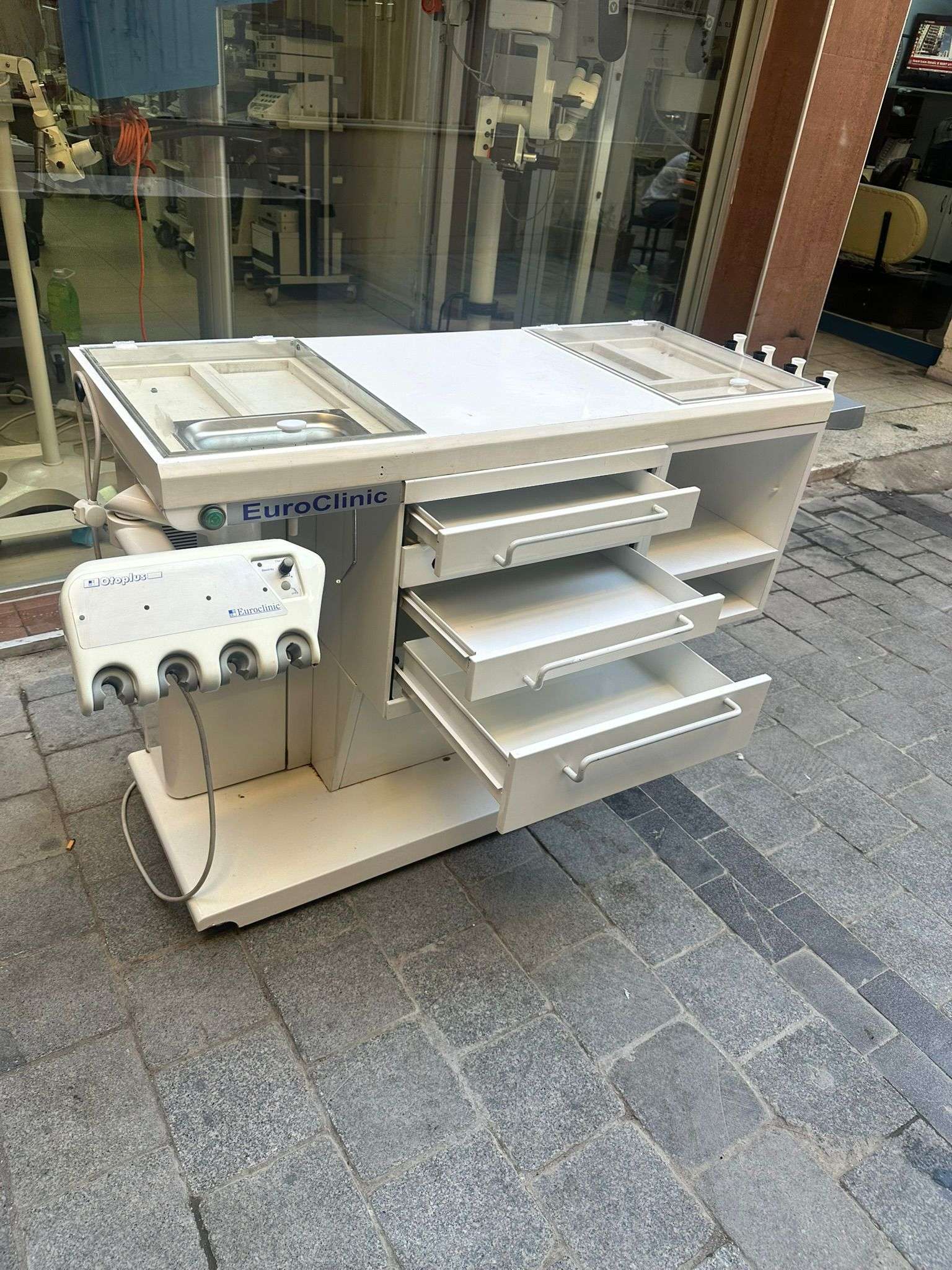 Görsellerde, tekerlekli bir ana gövdeye entegre edilmiş, medikal bir muayene ve tedavi ünitesi bulunmaktadır. Ürün; depolama için çekmeceler, açık raflar, çalışma yüzeyi ve alet konsolu gibi bileşenlerden oluşmaktadır. Cihazın genel yapısı ve üzerinde bulunan “Otoplus” ibaresi, ürünün Kulak Burun Boğaz (KBB) polikliniklerinde kullanılmak üzere tasarlanmış bir ünite olduğunu göstermektedir.
