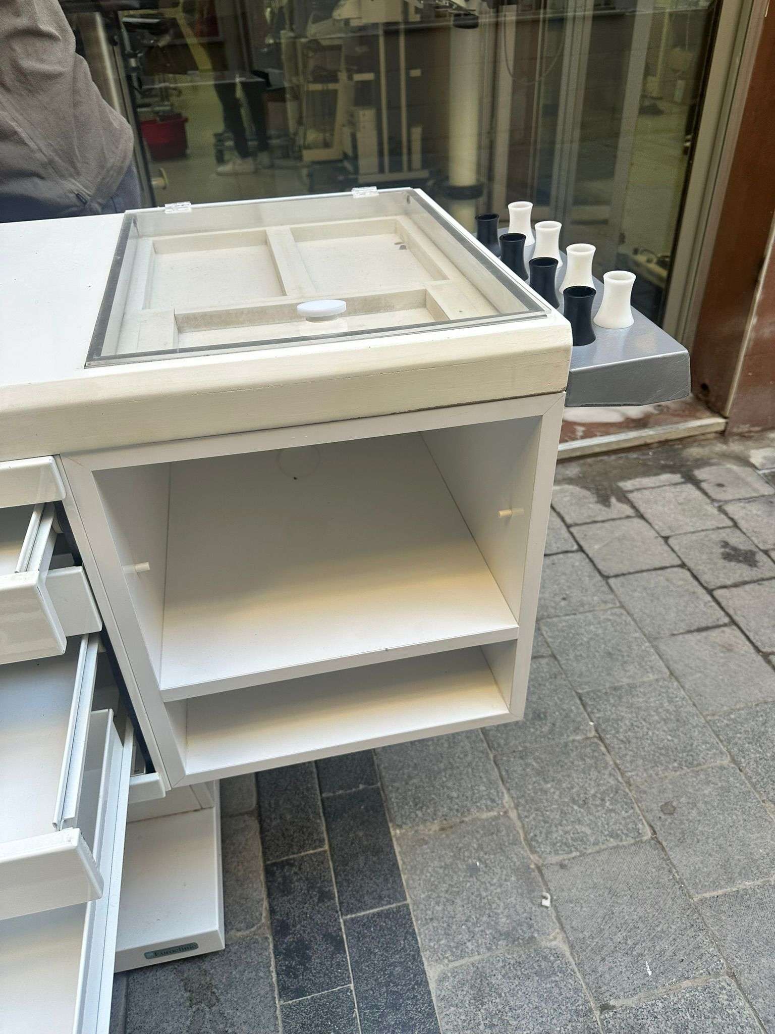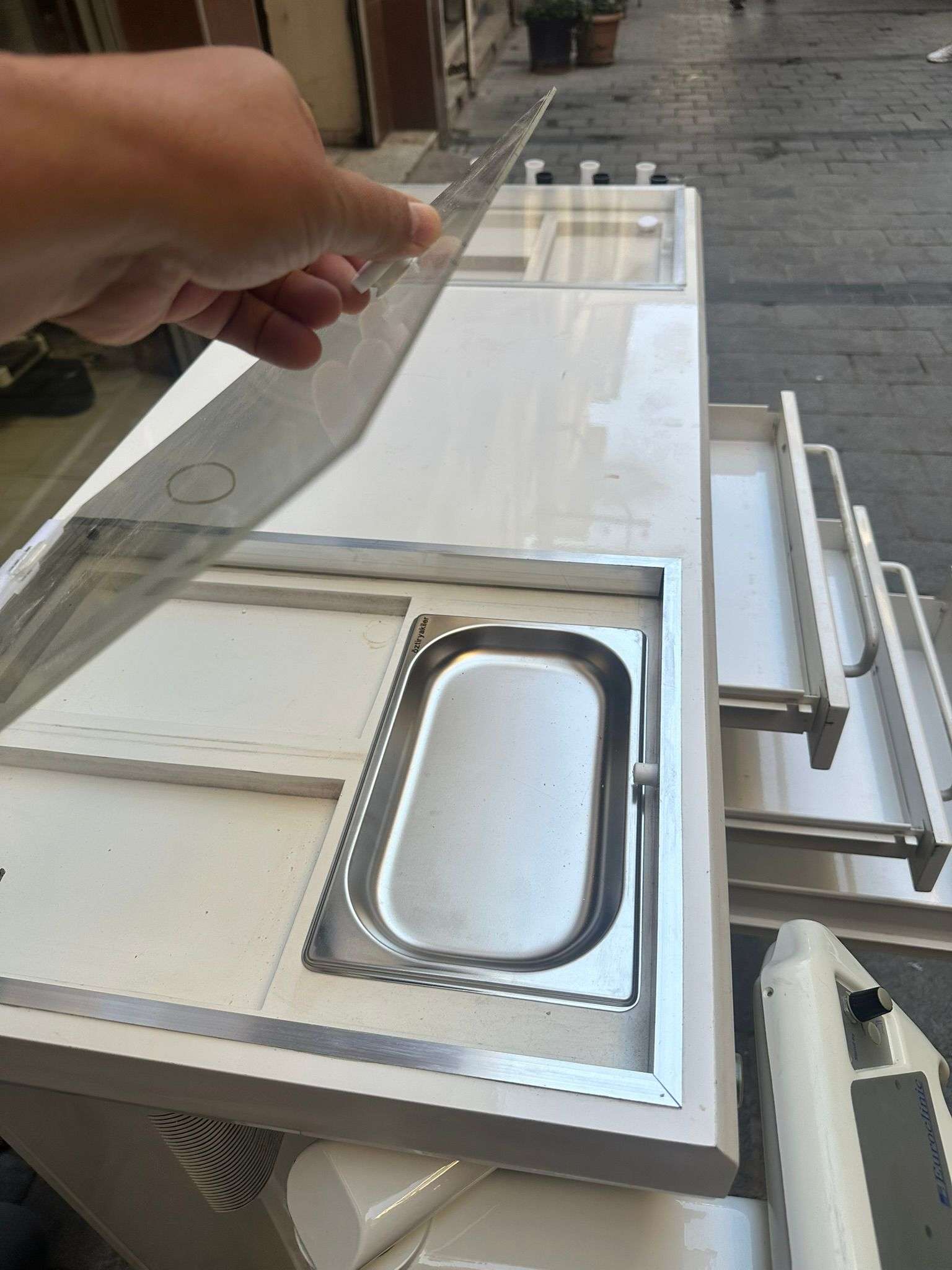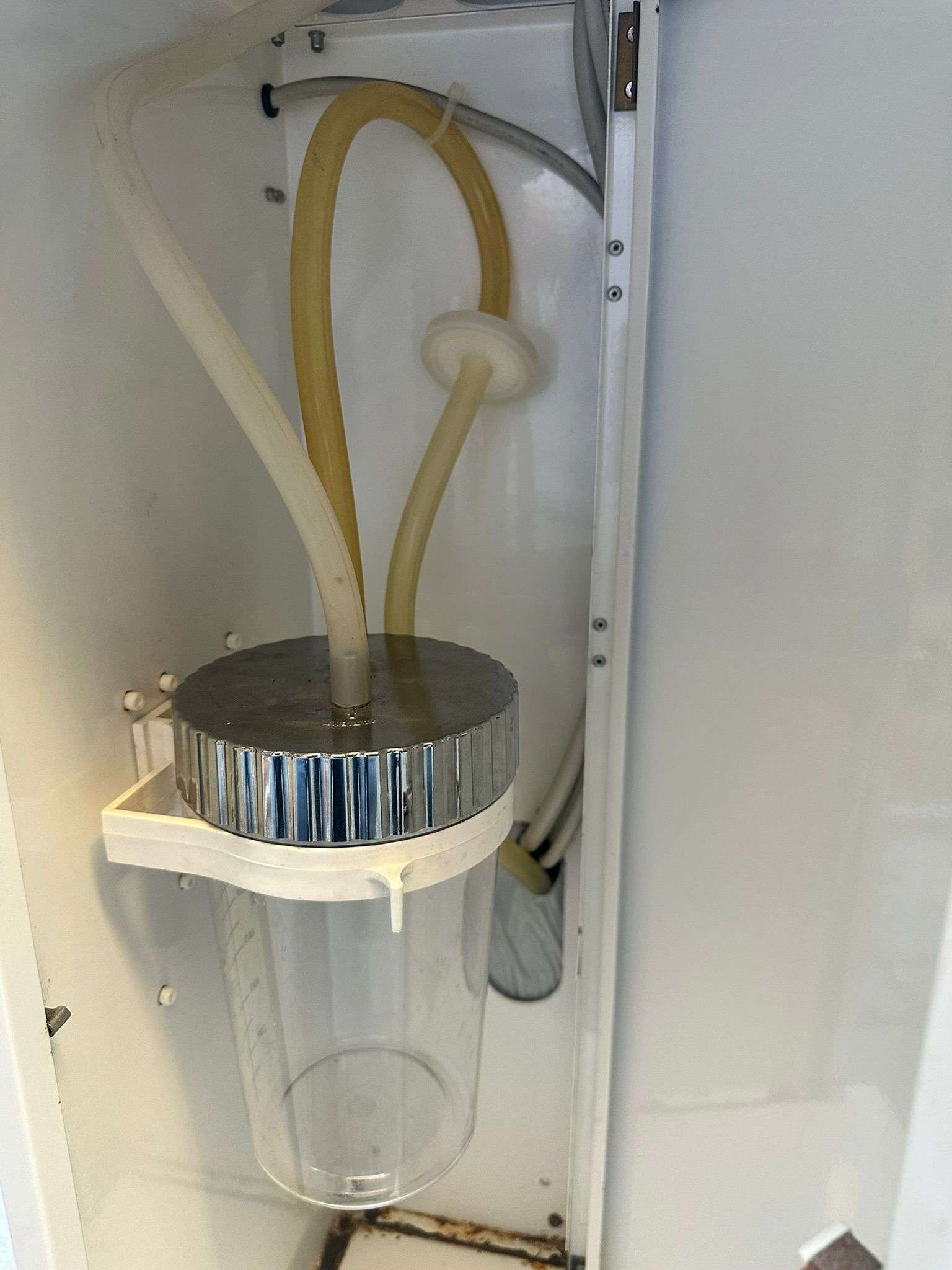 Cihaz üzerinde çalışmasına engel teşkil edecek net bir kırık veya arıza belirtisi görülmemektedir. Alet konsolundaki güç düğmesi sağlam görünmektedir. Ancak, bazı noktalar potansiyel risk olarak değerlendirilebilir. Özellikle aspirasyon sisteminin bulunduğu bölmenin zeminindeki paslanma, metal aksamın zamanla daha fazla zarar görebileceğine işaret etmektedir. Ayrıca, yaşlanma belirtileri gösteren hortumların ilerleyen zamanlarda sızdırmazlık özelliklerini kaybederek değiştirilmesi gerekebilir. Bu gözlemler dışında ünitenin genel mekanik aksamı iyi durumda görünmektedir.