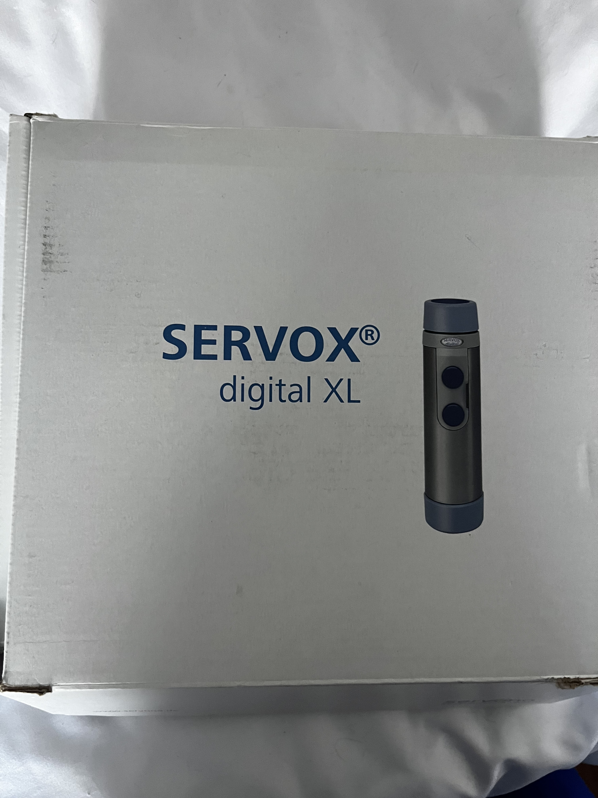 Görselde, bir ürünün orijinal ambalajı olan karton kutu yer almaktadır. Kutu üzerinde Servox digital XL ibaresi ve cihaza ait bir görsel bulunmaktadır. Bu bilgilere ve yapılan araştırmalara göre, ürünün larenjektomi (gırtlağın alınması) operasyonu geçirmiş veya çeşitli nedenlerle ses yetisini kaybetmiş hastalar için tasarlanmış, elektrolarenks tipi bir konuşma yardımcısı cihazı olduğu anlaşılmaktadır. Cihaz, elektronik olarak ses üreterek kullanıcıların iletişim kurmasını sağlar.