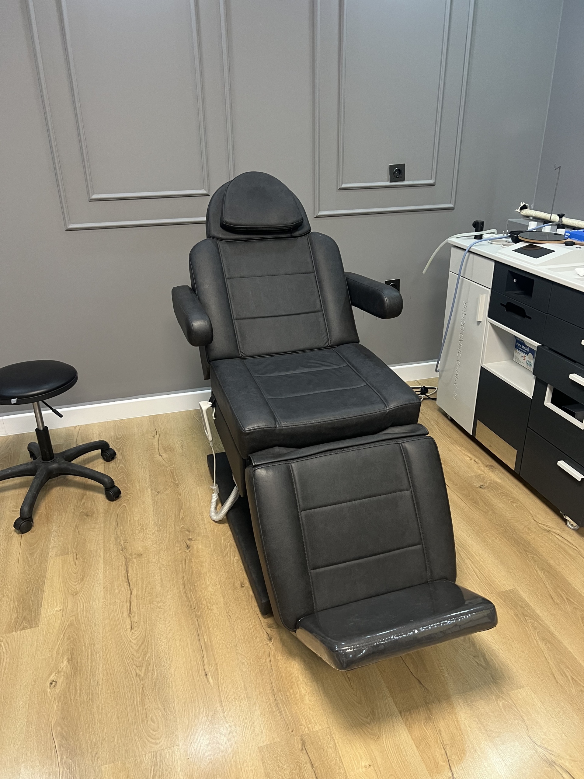 Görsellerde, siyah renkte bir adet motorlu fonksiyonel koltuk ve ona eşlik eden bir adet tekerlekli tabure yer almaktadır. Ürünlerin genel tasarımı ve yapısı, güzellik merkezleri, dövme stüdyoları veya medikal estetik klinikleri gibi alanlarda kullanılmaya uygun olduğunu göstermektedir. Koltuğun yanında, cihaza bağlı olduğu anlaşılan beyaz renkli bir kablo bulunmaktadır, bu da koltuğun elektrikle çalışan fonksiyonlara sahip olduğuna işaret etmektedir.