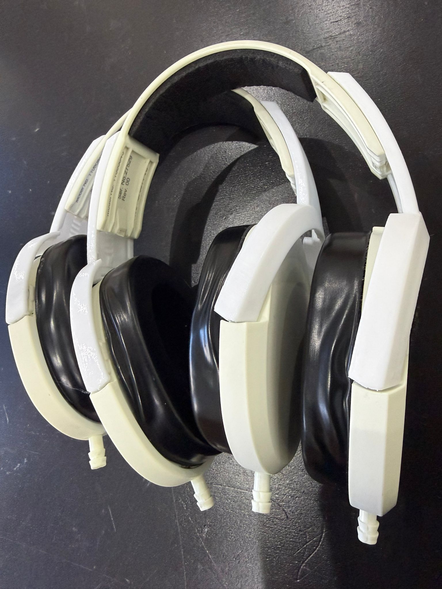 Kulaklıkların alt kısımlarında yer alan beyaz renkli hortum giriş uçları (barb connector) sağlam görünmektedir. Bu uçlarda herhangi bir kırılma veya tıkanıklık gözlemlenmemiştir. Pnömatik hortum bağlantısının yapıldığı bu noktalar kritik öneme sahiptir ve görsel olarak işlevsel durumdadır. Kafa bandı ayar mekanizması ve yastıklama süngerleri (kafa üstü pedi) görselde mevcuttur, siyah sünger kısımda zamanla oluşabilecek doğal aşınma belirtileri haricinde kopma yoktur.