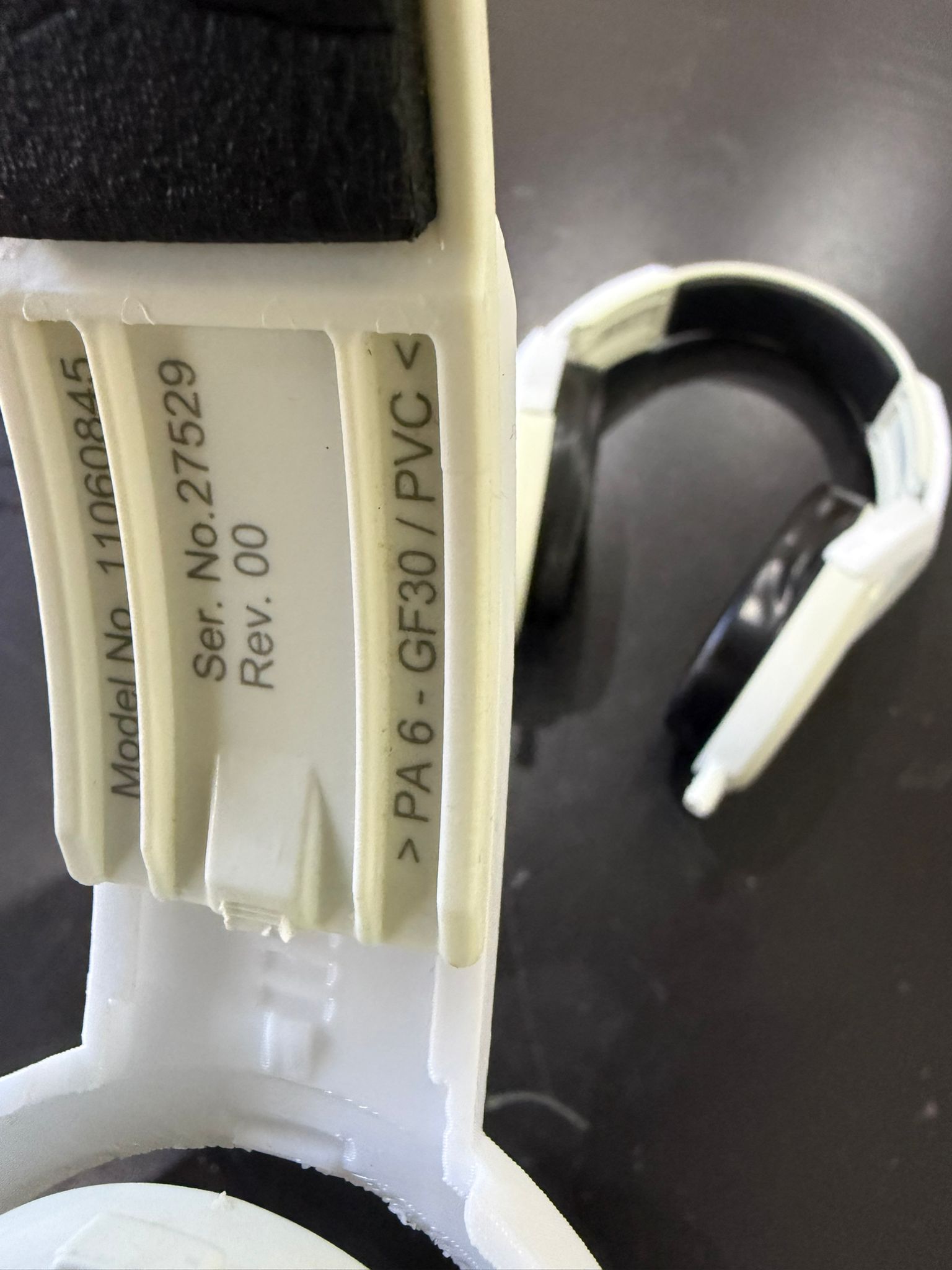 Ürün üzerindeki kalıp baskı etiketler, seri numarası, model numarası ve malzeme bilgisinin işlenmiş olması, ürünün orijinal bir medikal yedek parça olduğunu doğrulamaktadır. Kalıplama kalitesi ve yazıların netliği endüstriyel standartlardadır.