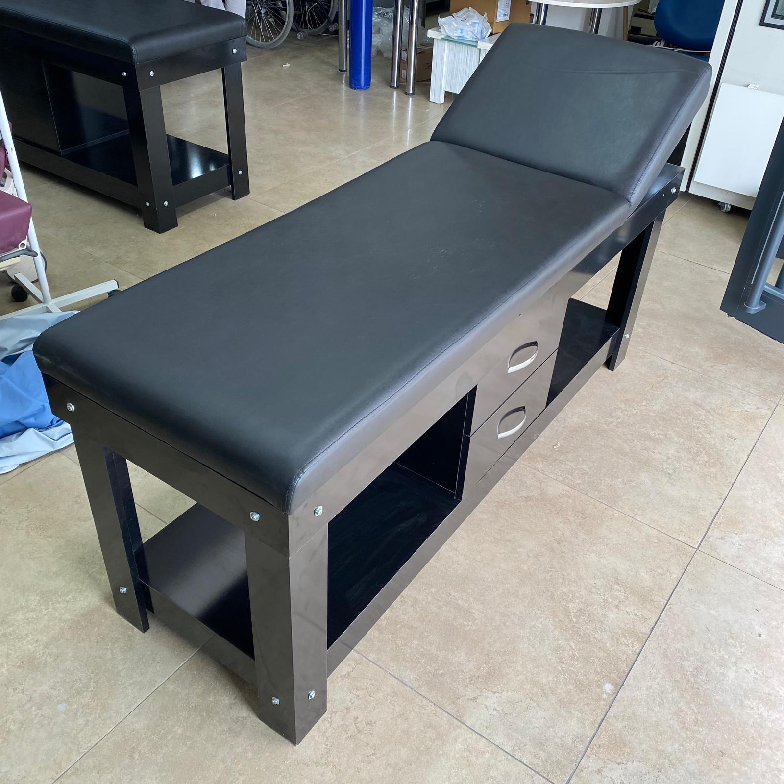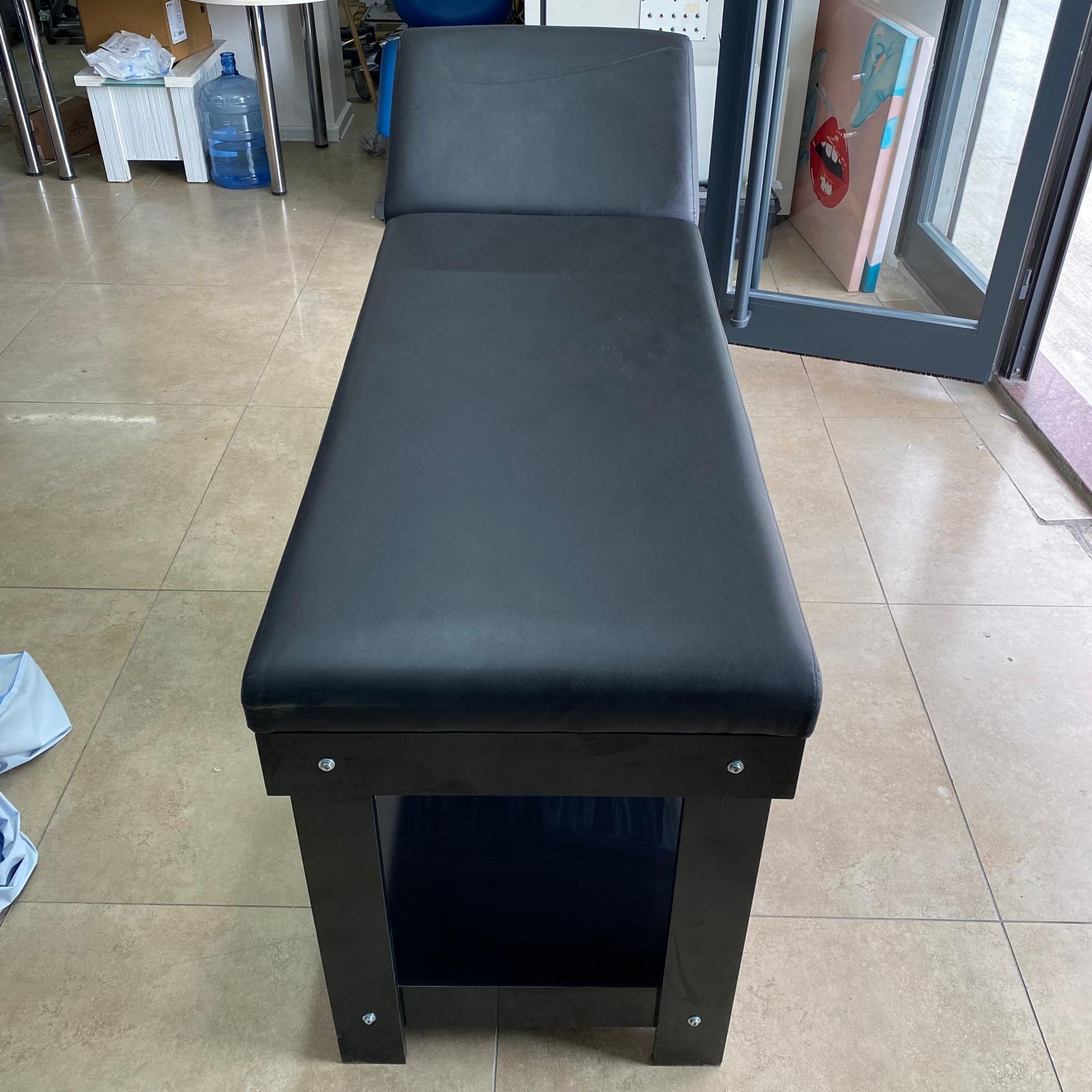 Görsellerde, parlak siyah renkte, ahşap veya lamine malzemeden üretilmiş bir muayene masası yer almaktadır. Ürünün üst yüzeyi siyah suni deri ile kaplanmıştır ve baş kısmı manuel olarak ayarlanabilir bir yapıya sahiptir. Bu masa, sağlık kuruluşları, fizyoterapi merkezleri, güzellik salonları veya masaj salonları gibi profesyonel ortamlarda muayene, tedavi veya bakım işlemleri için kullanılmak üzere tasarlanmıştır.