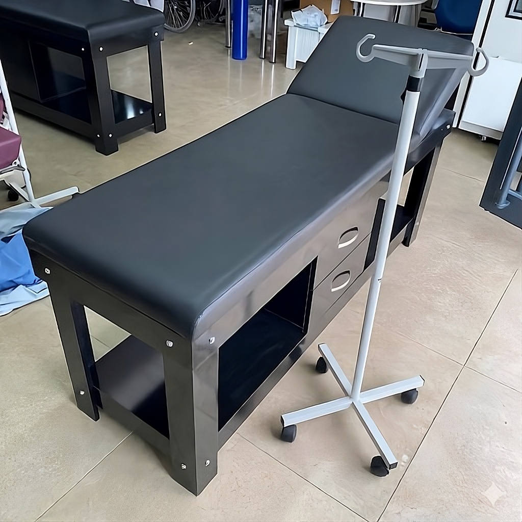 - Depolama Alanları: Ürünün alt kısmında iki adet çekmece ve iki adet açık raf bölümü yer almaktadır. Bu alanlar, muayene sırasında gerekli olan malzeme veya ekipmanları depolamak için ek işlevsellik sunar.