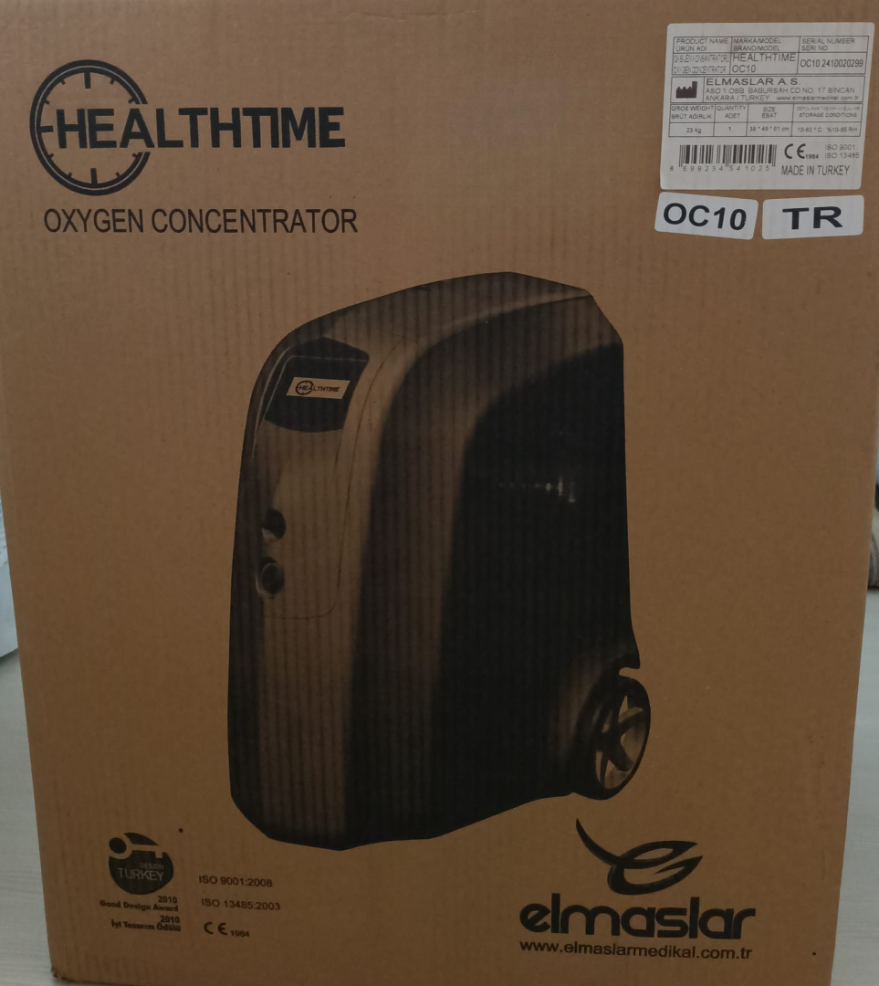 Görsellerde, ortam havasından aldığı oksijeni yoğunlaştırarak kullanıma sunan tıbbi bir cihaz olan Healthtime OC10 model bir oksijen konsantratörü ve orijinal kutusu yer almaktadır. Ürün, evde veya klinik ortamlarda oksijen tedavisi için tasarlanmıştır. Cihazın üzerindeki marka ve model yazıları, logolar ve kutu üzerindeki bilgiler incelendiğinde ürünün orijinal olduğu anlaşılmaktadır. Cihaz, dakikada 10 litre (10 LPM) kapasiteli oksijen akışı sağlama kapasitesine sahiptir. Görseldeki cihazın genel temiz ve düzenli görünümü, özenli kullanıldığına işaret etmektedir.