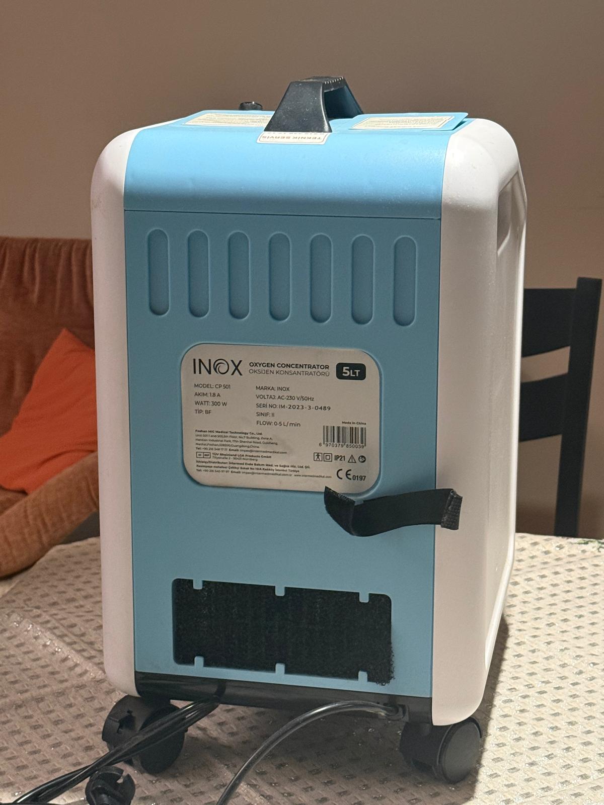 Görsellerde, Inox marka CP-501 model 5 litre kapasiteli bir adet oksijen konsantratörü bulunmaktadır. Cihaz, ortamdaki havadan azotu ayrıştırarak tıbbi amaçlı kullanıma uygun yoğunlaştırılmış oksijen üretme işlevine sahiptir. Ürün, ev veya klinik ortamında solunum desteğine ihtiyaç duyan kullanıcılar için tasarlanmıştır. Görsellerde cihazın kendisi dışında ek bir aksesuar bulunmamaktadır.