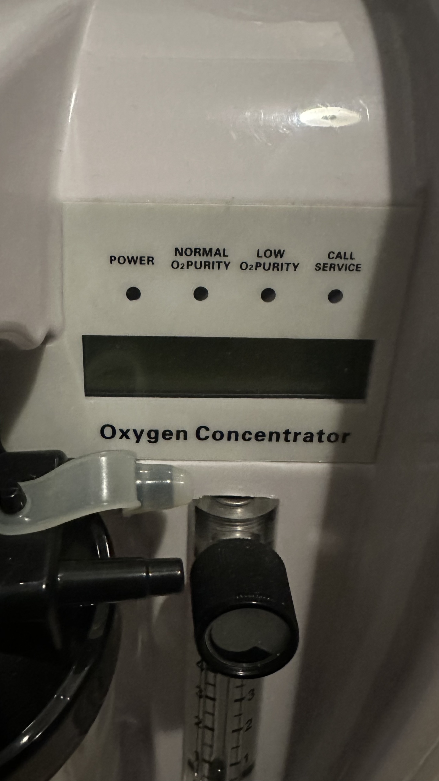 Elektronik panel üzerinde, çalışır durumda olduğunu gösteren POWER, oksijen saflığının normal olduğunu belirten NORMAL O2 PURITY, oksijen saflığının düştüğünü gösteren LOW O2 PURITY ve teknik servis ihtiyacını belirten CALL SERVICE uyarı LED’leri bulunmaktadır. Cihaz kapalı olduğu için bu ışıkların ve panelin çalışıp çalışmadığı görsel üzerinden teyit edilememektedir. Panelde ayrıca, cihazın toplam çalışma süresini gösterebilecek bir dijital ekran bulunmaktadır; ancak cihaz kapalı olduğu için ekranda herhangi bir bilgi okunmamaktadır.