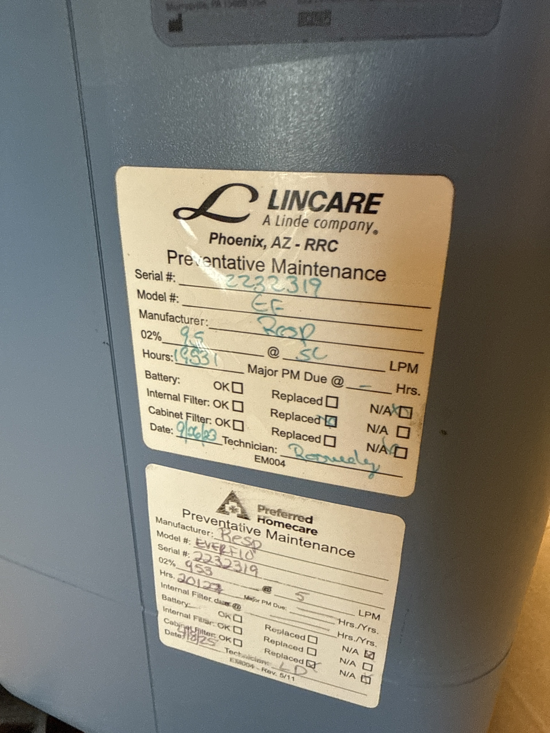Cihaz üzerinde “Lincare” ve “Preferred Homecare” firmalarına ait iki adet bakım etiketi bulunmaktadır. Bu etiketler, cihazın kullanım süresini ve bakım geçmişini belgelemektedir.
