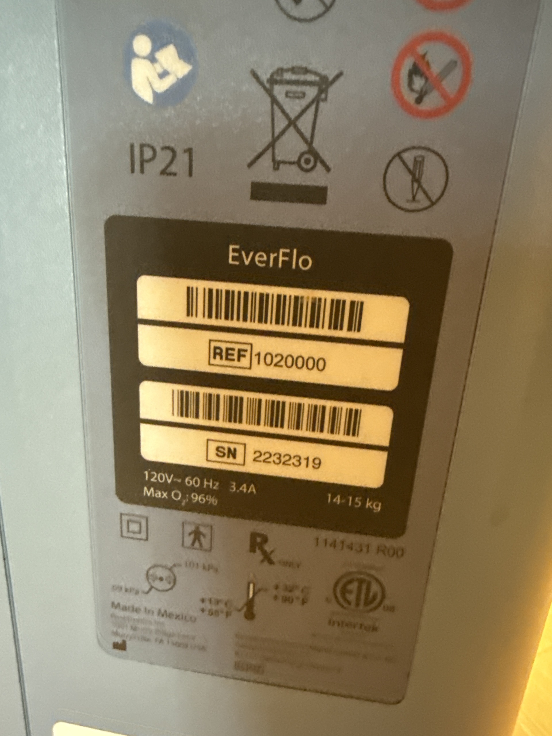 Görsellerde yer alan cihaz, bir adet Respironics EverFlo model oksijen konsantratörüdür. Bu cihaz, solunum desteğine ihtiyaç duyan hastalara medikal düzeyde oksijen sağlamak amacıyla kullanılır. Ürünün üzerindeki etiketler, seri numarası tutarlılığı ve genel işçilik kalitesi, cihazın orijinal olduğunu göstermektedir. Görsel incelemelere ve bakım etiketlerindeki bilgilere dayanarak cihazın daha önce kullanıldığı ve periyodik bakımlarının yapıldığı anlaşılmaktadır.